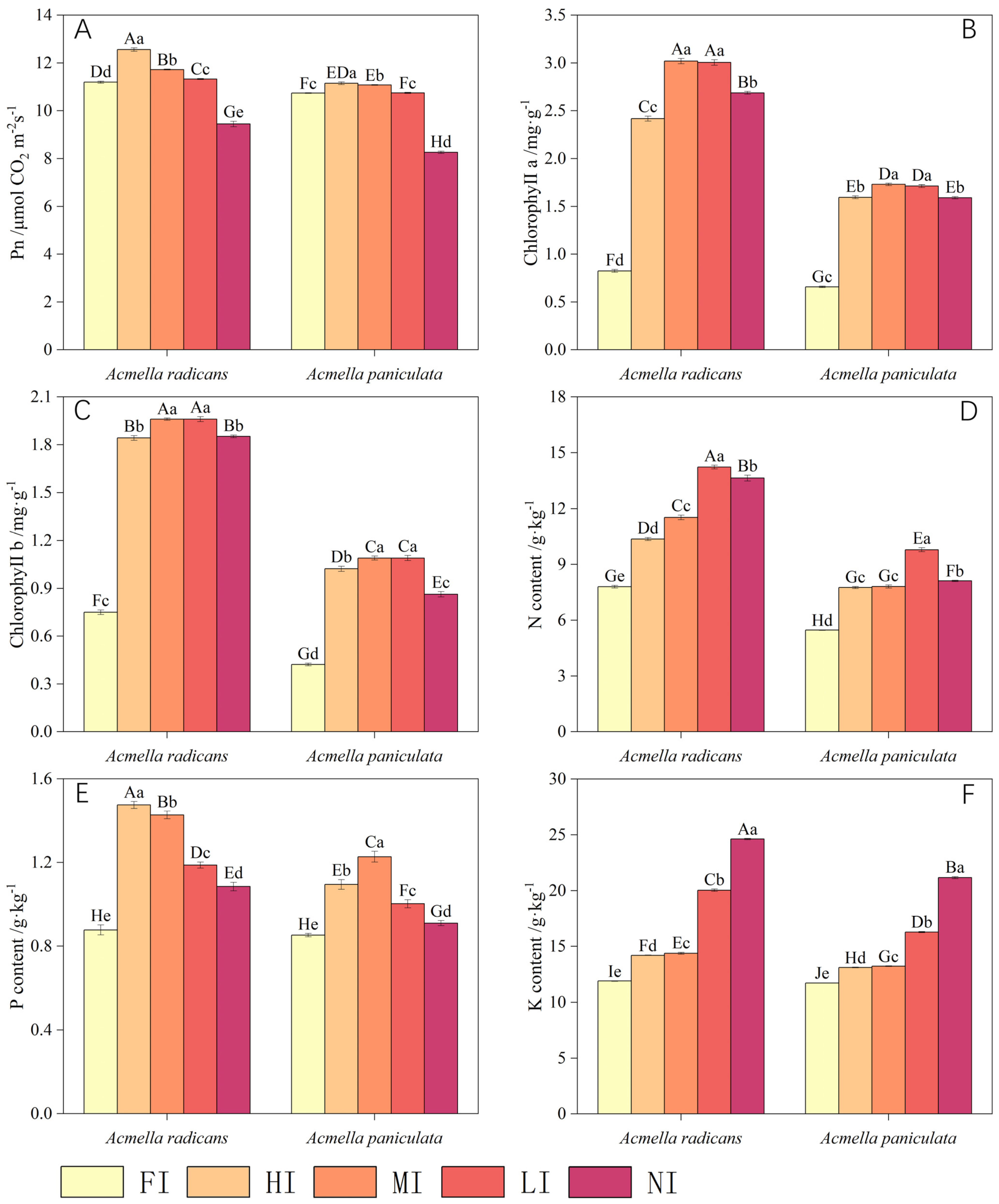 Figure 3. Photosynthetic and plant nutrient properties of Acmella radicans and Acmella paniculata under different light levels [FI = full irradiance (100%), HI = high irradiance (75%), MI = moderate irradiance (50%), LI = low irradiance (25%), NI = non irradiance (5%)] for (A) Pn, (B) chlorophyll a, (C) chlorophyll b, (D) N content, (E) P content, and (F) K content. Different small and capital letters above bars indicate a significant difference at 0.05 level for one species and between two species under different treatments, respectively.