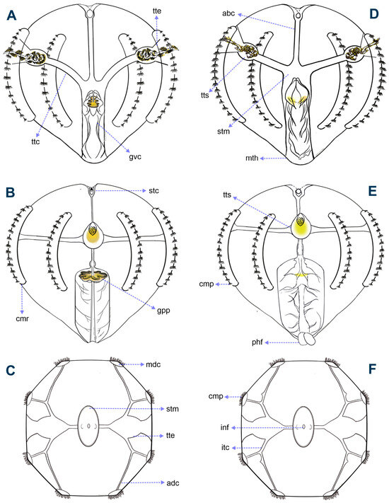 Schemes and principal morphological features of Mexican Pleurobrachia individuals observed in the Southern Mexican Pacific coast (POcM) region (A–C) and in the Gulf of Mexico (GoM) region (D–F). Side tentacular view (A,D). Side esophageal view (B,E). Aboral view (C,F). Abbreviations: abc, aboral canal; adc, adradial canal; cmp, comb plate; cmr, comb row; gpp, gastrovascular pigmentation pattern; gvc, gastrovascular cavity; inf, infundibulum; itc, interradial canal; mdc, meridional canal; mth, mouth; phf, pharyngeal folds; stc, statocyst; stm, stomach; ttc, tentacle canal; tte, tentacle sheath exit; and tts, tentacle sheath.