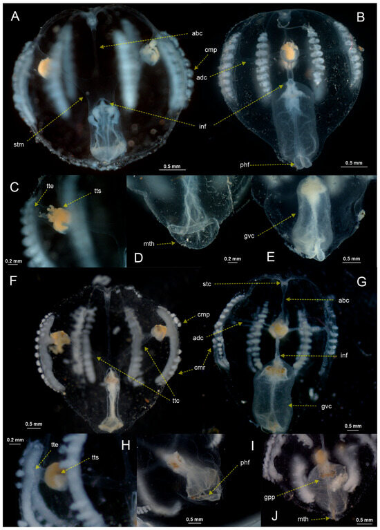 Discrete morphological attributes showing the distinctive character states of the individuals analyzed in the Gulf of Mexico (GoM) region (A–E) and in the Southern Mexican Pacific coast (POcM) region (F–J). Side tentacular view (A,F). Side esophageal view (B,G). Zoom to the tentacle sheath in the side tentacular view (C,H). Zoom to the gastrovascular cavity in the side tentacular view (D,E,I,J). Abbreviations: abc, aboral canal; adc, adradial canal; cmp, comb plate; cmr, comb row; gpp, gastrovascular pigmentation pattern; gvc, gastrovascular cavity; inf, infundibulum; mth, mouth; phf, pharyngeal folds; stc, statocyst; stm, stomach; ttc, tentacle canal; tte, tentacle sheath exit; and tts, tentacle sheath.