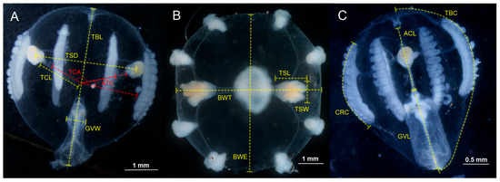 - Total body length (TBL). From the statocyst to the mouth opening, in the tentacular plane [45,60] (Figure 3).