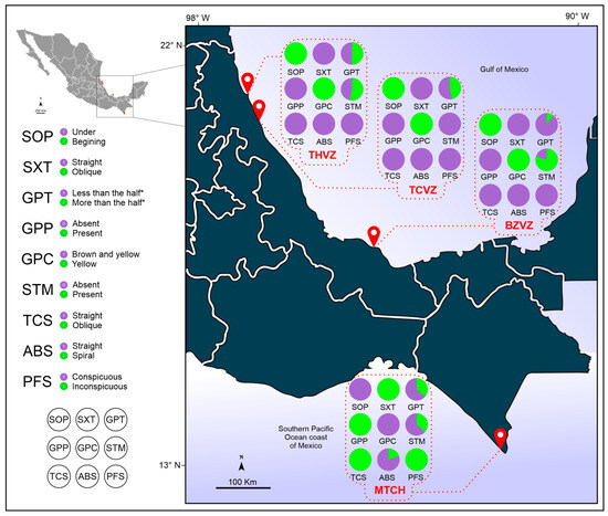 Distribution of distinctive morphological attributes of Pleurobrachia sp. from several locations in Mexican coast localities. Localities: THVZ, Tamiahua estuary; TCVZ, Tampamachoco lagoon; BZVZ, Balzapote bay; and MTCH, Madero port. Abbreviations: ABS, aboral canal shape; GPC, pigmentation pattern color of the GVC; GPP, pigmentation pattern of the GVC; GPT, proportion of the GVC; PFS, pharyngeal fold size; SOP, tentacle sheath opening; STM, stomach tissue margin; SXT, tentacle sheath exit; and TCS, tentacular canal shape.