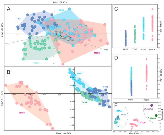Scatter plots of ordination analyses to evaluate the morphological variation in Mexican Pleurobrachia specimens. Linear discriminant analysis (LDA) using 14 continuous quantitative characters, (A). Principal coordinate analysis (PCoA) using the 24 discrete and 14 continuous features of all specimens (B). Generalized linear model (GLM) using principal component 1 (PC1) vs. localities (C) and generalized linear model using PC1 vs. regions (D). Non-metric multidimensional scaling (NMDS) using only the 24 discrete attributes and adding the species P. pileus and P. bachei (E). In the center of the scatter plot, vectors correspond to the contribution of the traits in the multivariate space (A). Abbreviations: GoM, Gulf of Mexico; POcM, Southern Mexican Pacific coast; THVZ, Tamiahua estuary; TCVZ, Tampamachoco lagoon; BZVZ, Balzapote bay; MTCH, Madero port; ACL, aboral canal length; ATC, tentacular canal angle; BWE, total body width in the esophageal plane; BWT, total body width in the tentacular plane; CRC, comb row circumference; GVL, gastrovascular cavity length; GVW, gastrovascular cavity width; TBC; total body circumference; TBL, total body length; TCA, angle between tentacular canals; TCL, tentacular canal length; TSD, horizontal distance between tentacle sheaths; TSL, tentacle sheath length; and TSW, tentacle sheath width.