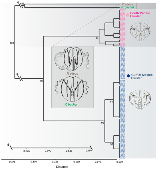 The morphological evidence obtained and compared supports the idea that the specimens found in the GoM and POcM regions belong to two unique morphotypes with evident and diagnosable characteristics. No correspondence was found with the descriptions of the species previously assigned as P. pileus and P. bachei [10,11,16,17,19,21,22,23] (Figure 5E and Figure 6).
