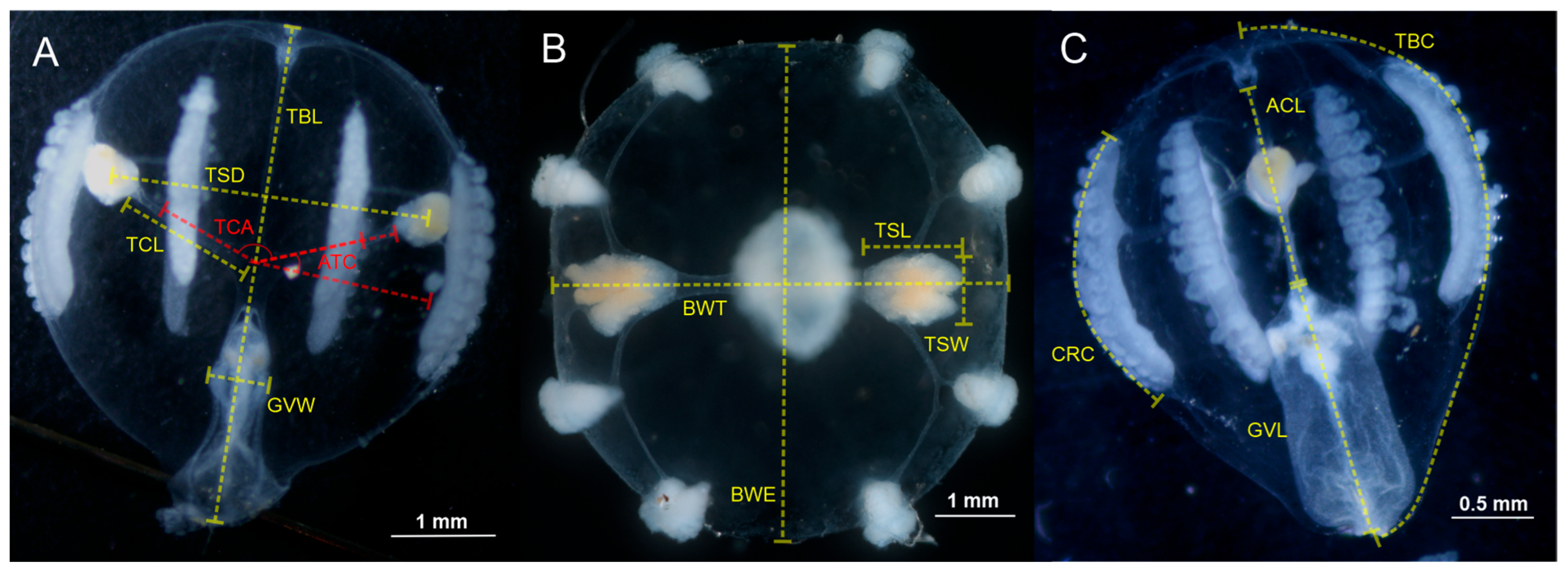 - Total body circumference (TBC). From the statocyst to the pharyngeal fold, measured by one side and duplicated for symmetry, in the tentacular plane (Figure 3).