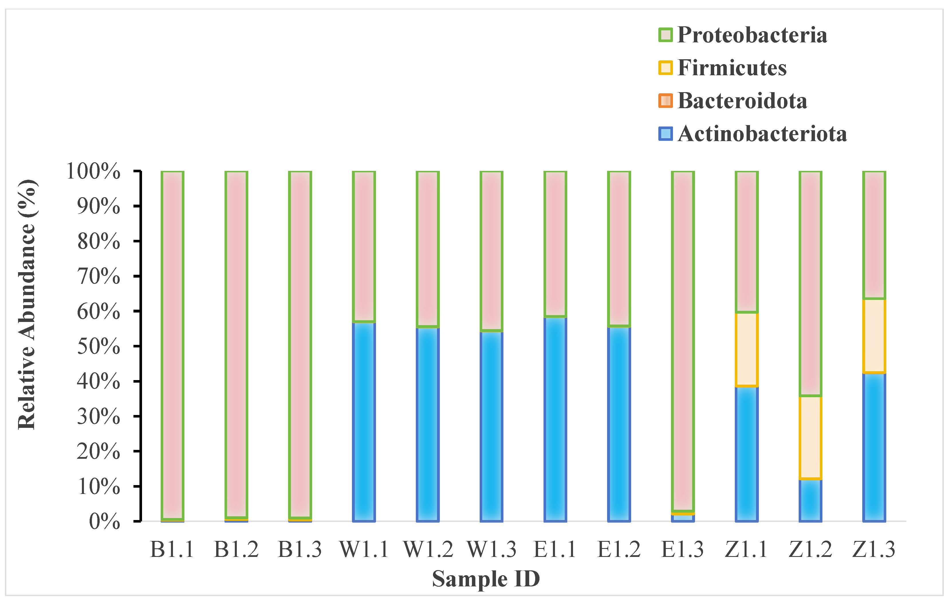 Species evenness, which reflects how uniformly microbial species are distributed within a sample, was highest in E1.1 (0.170) and lowest in B1.3 (0.094). This suggested that E1.1 maintained a more balanced distribution of bacterial species, whereas B1.3 was characterized by a skewed distribution, where certain species were significantly more dominant than others. The Shannon diversity index, which accounts for both species richness and evenness, was highest in E1.1 (0.745) and lowest in B1.3 (0.467). This aligned with the observed trends in evenness and richness, confirming that E1.1 exhibited the most diverse and well-balanced bacterial community, whereas B1.3 had a more restricted and uneven microbial composition.