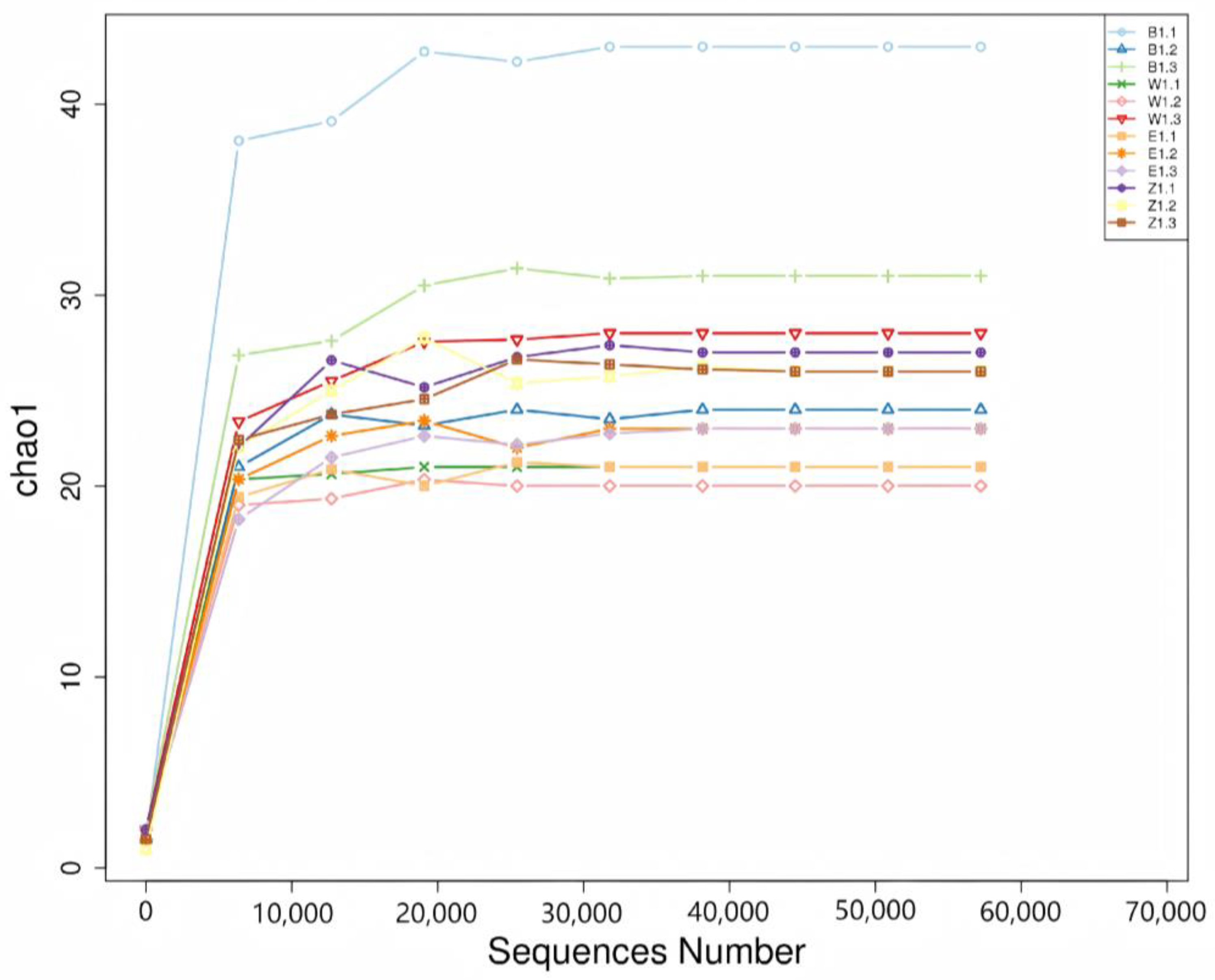 Table 3). A comparative analysis revealed that B1.1 exhibited the highest species richness, with a Chao_1 index of 43.0, whereas W1.2 and E1.1 had the lowest richness values, at 20.0 and 21.0, respectively. This indicated that B1.1 harbored a more diverse endophytic bacterial community, while W1.2 and E1.1 had a more limited bacterial repertoire. Regarding species dominance, B1.3 and Z1.3 exhibited the highest dominance values, at 0.897 and 0.865, respectively, suggesting that only a few bacterial species were highly prevalent in these samples. namely