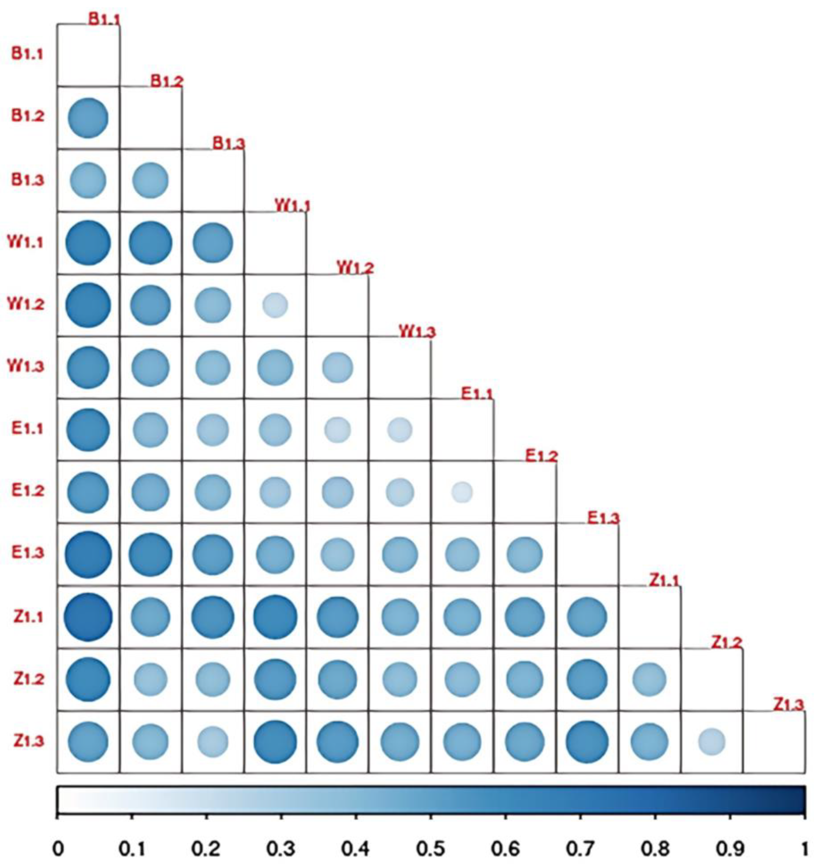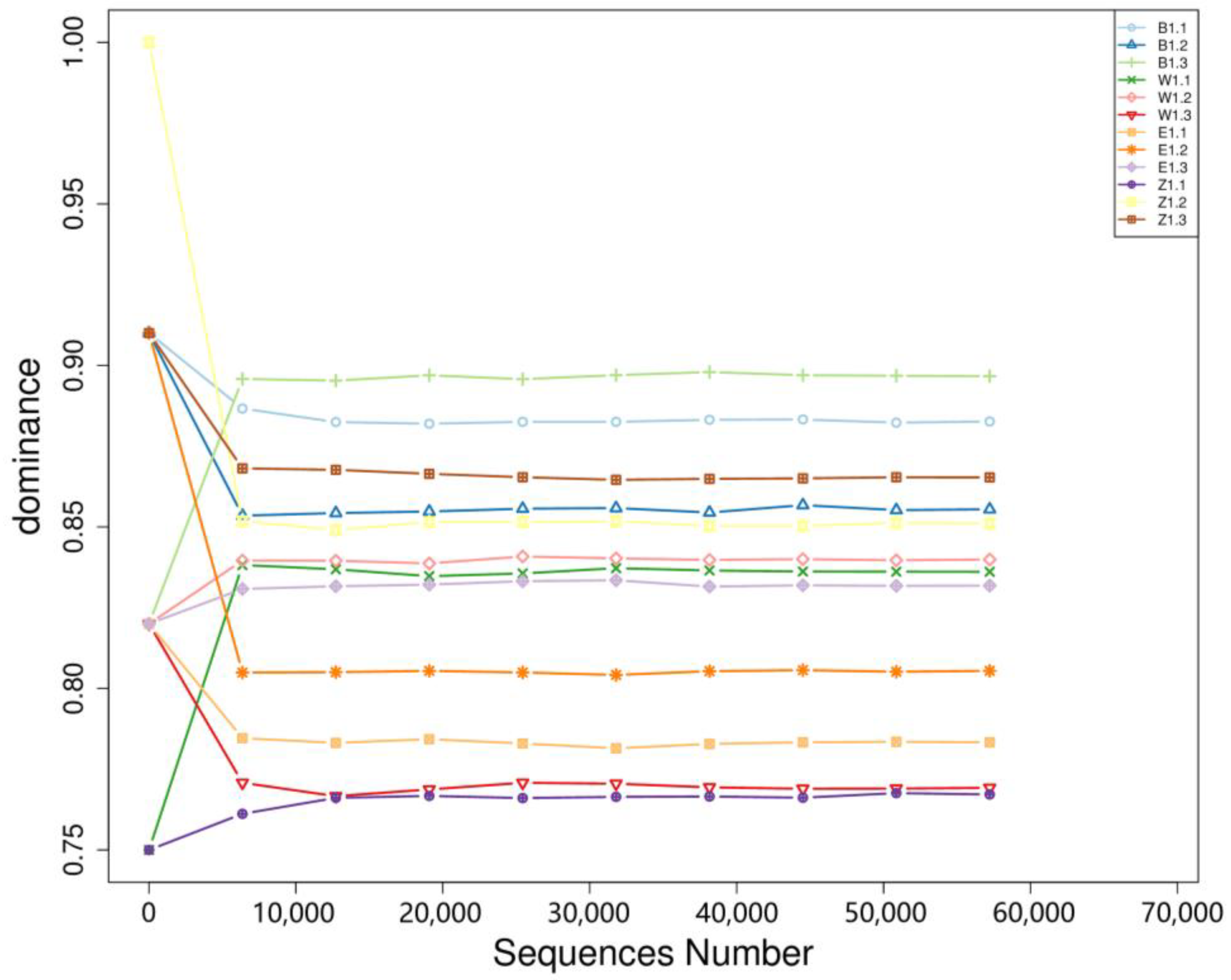 An analysis of the relationship between species diversity and dominance across samples revealed a clear inverse correlation. Samples with higher species diversity—including B1.1, W1.1, E1.2, and Z1.1—exhibited lower dominance values, indicating that microbial communities in these samples were more evenly distributed, with no single bacterial species overwhelmingly dominating the population. This suggested a more balanced microbial ecosystem, where multiple species coexisted without one becoming overly dominant. Conversely, samples with lower species diversity—such as B1.2, B1.3, W1.2, W1.3, E1.1, and E1.3—displayed higher dominance values, meaning that only a few bacterial species were predominant, while the rest of the microbial community was less represented. This pattern suggested that in environments with reduced microbial diversity, certain species tended to outcompete others, establishing dominance within the community.