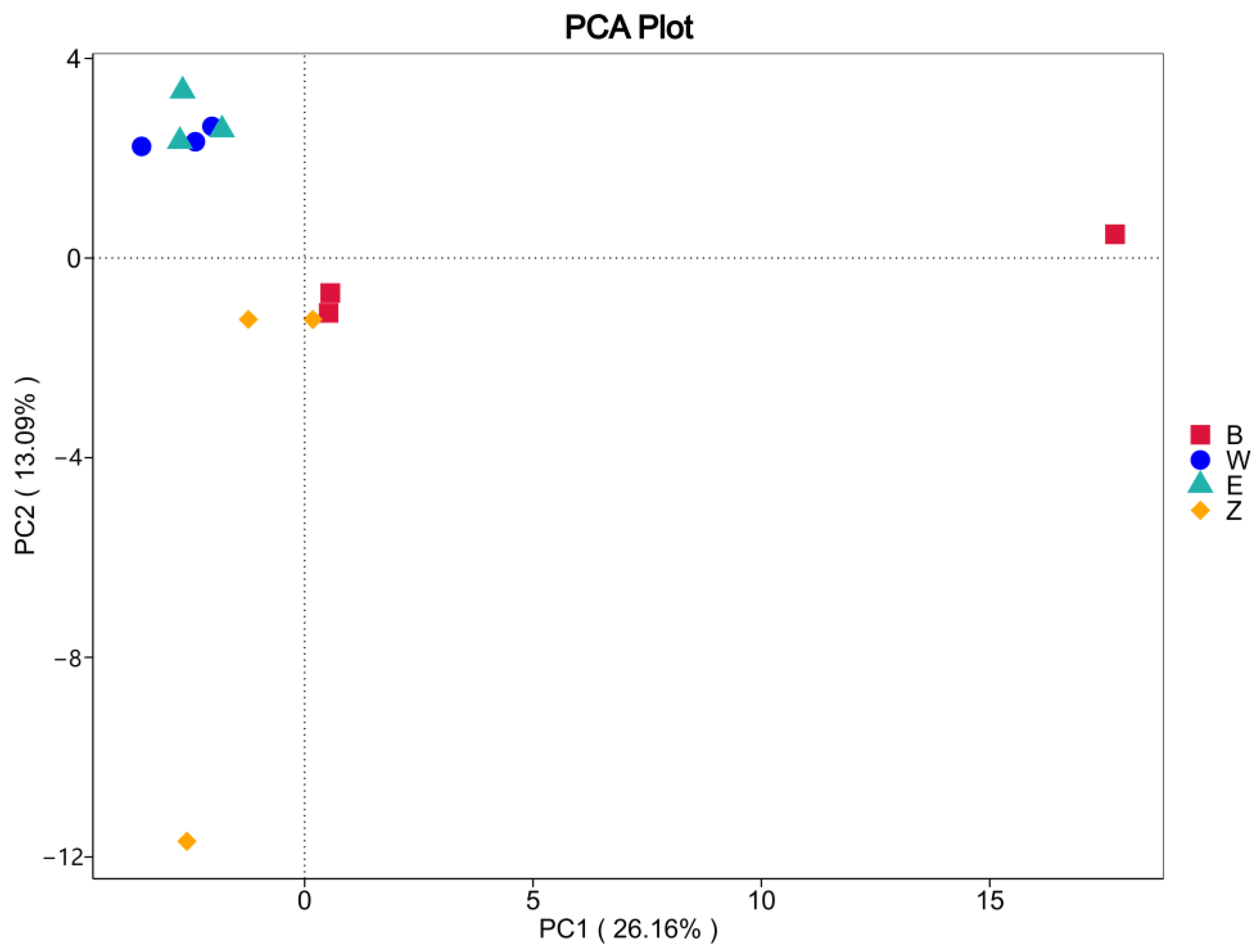 Figure 6). The first principal component (PC1) accounted for 26.16% of the variation, while the second principal component (PC2) explained 13.09% of the variation. Samples from groups W and E clustered tightly in the upper left quadrant, indicating that these two groups share highly similar endophytic bacterial community structures that are distinctly separate from those of the other species. In contrast, the Z group samples were distributed across the central to lower left portions of the plot. Within this group, one cluster in the middle left was positioned adjacent to the B group—albeit with some separation—while another formed a more loosely organized cluster. This distribution suggested that, although the Z group samples exhibit a degree of internal similarity, their overall consistency is somewhat lower compared to the more tightly clustered W and E groups. Notably, the B group samples formed an independent cluster on the right side of the plot. This distinct grouping indicated that while the B group shares similar community structures among its own samples, its endophytic bacterial profile is markedly different from those of the W, E, and Z groups. Overall, these results demonstrated that endophytic bacterial community structures are relatively consistent within individual