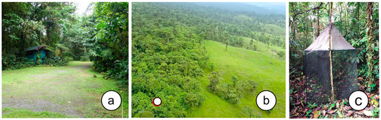 Approximate sites of three Malaise traps at Nectandra. (a)—Trap 1, open parking area surrounded by forest. (b)—Trap 2, just within the boundary of windswept forest edge (white dot indicates position of trap). (c)—Trap 3, closed forest interior.