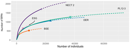 These data were compared with collections from four nearby sites (within 200 km, but on the Pacific slope), including those obtained from the PL12 site [11], a geothermal development in the forest of Parque Nacional Rincon de la Vieja (ACG). Accumulation curves were derived from Chao’s shiny R app iNext [17,18], with a doubling of collection effort for each site indicated by the dashed line. Similarity was based on Jaccard statistics on downloaded data from BOLD. The observed BIN richness, extrapolation of BIN richness, and similarity among and within site were made with SpadeR [19] using the iChao1 index, an improved version of the Chao1 index that uses the number of singleton and doubletons to calculate the number of unencountered species.