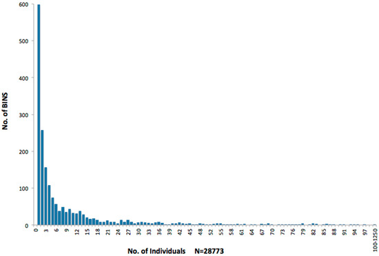 - Ratnasingham, S.; Hebert, P.D. A DNA-based registry for all animal species: The barcode index number (BIN) system. PLoS ONE 2013, 8, e66213. [Google Scholar] [CrossRef]