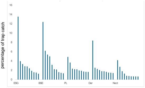 Percentage of total number of BINs at a site made up by specimens of the 10 most abundant phorid fly BINs. From four sites from ACG and Nectandra. See also SI—Table S4. Abbreviations: ESG (wet tropical forest), BSE (dry tropical forest), PL (transitional forest), Der—Derrumbe (cloud forest), and Nect—Nectandra (cloud forest).