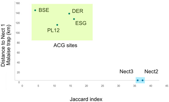Jaccard indices for Malaise traps catches of Phoridae from three Nectandra sites, the sites in Area de Conservación de Guanacaste [11], and three other sites. Abbreviations: Nect 1-3—Nectandra sites 1-3, PL—Pailas 12-3, PL12-5 (transitional forest), DER (cloud forest), BSE (dry tropical forest), and ESG (wet tropical forest).