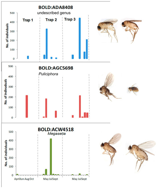 The three most common BINs from Nectandra were a species of undescribed genus related to Myriophora Brown (1238 individuals BOLD:ADA8408), a Puliciphora Dahl species (one of the Metopina group of genera—BOLD:AGC5698 with 834 individuals), and a Megaselia (BOLD:ACW4518 with 514 individuals). Within the Nectandra site, July showed peak density for all three of the most abundant BINs at all trap sites (Figure 7). The specimens of the undescribed genus were observed in higher numbers in Trap 3 (understory forest) than in Trap 2 (partially exposed forest) and in Trap 1 in a clearing. The 834 Puliciphora specimens were present in all three traps but persisted for a longer duration at Trap 3. In contrast, the 513 Megaselia BOLD:ACW4518 were caught by Trap 2 throughout the entire 6-month period. The significance of the different patterns is unclear but warrants further elucidation.