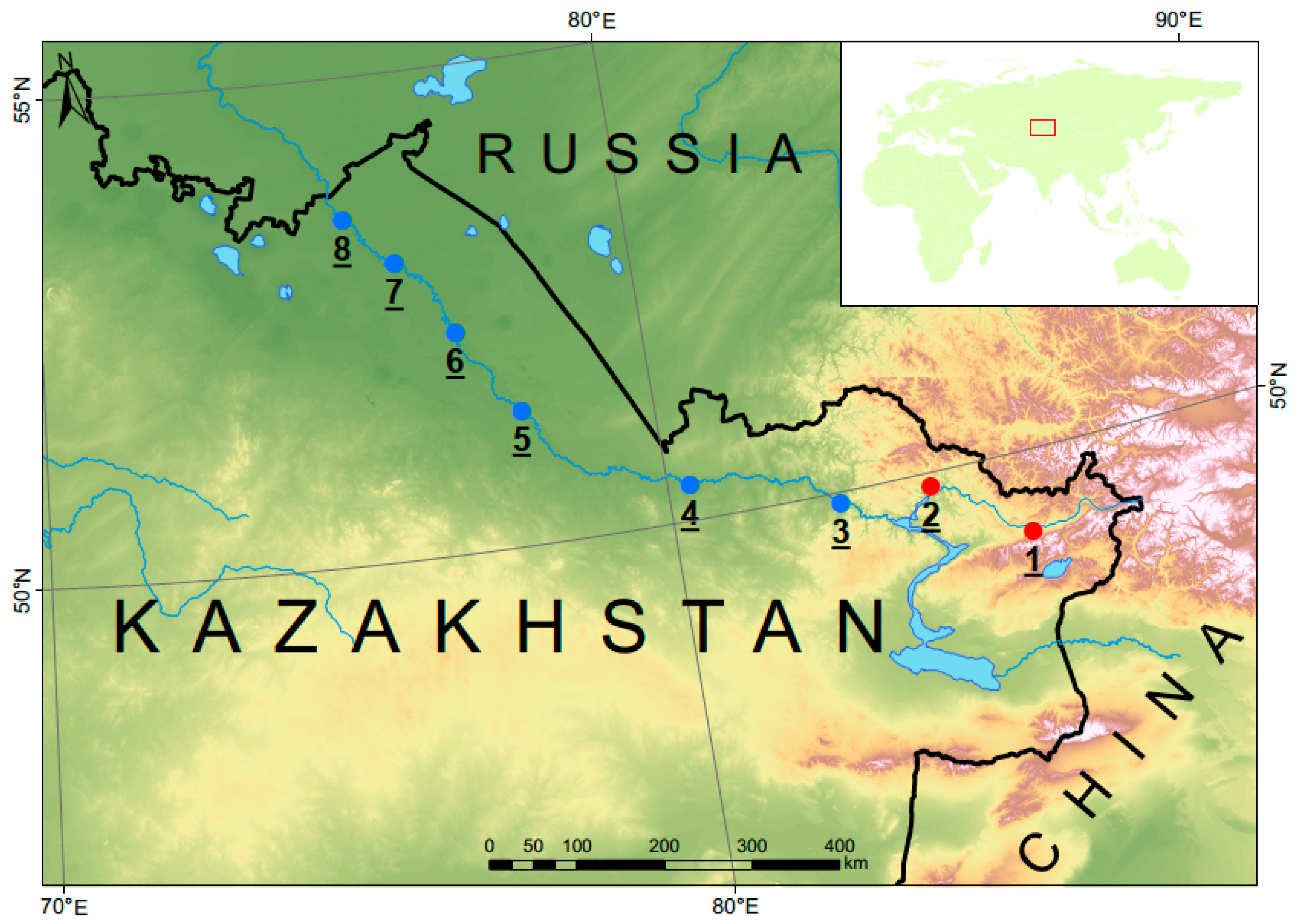 3 | East Kazakhstan region, Ust-Kamenogorsk city | Lowland–plain belt of the Irtysh River; main channel with a rocky–sandy bottom | 49°53′27″ N 82°41′01″ E | 332 | ±17 | S. reptans: 1 pupa; W. equinum: 2 pupae. |