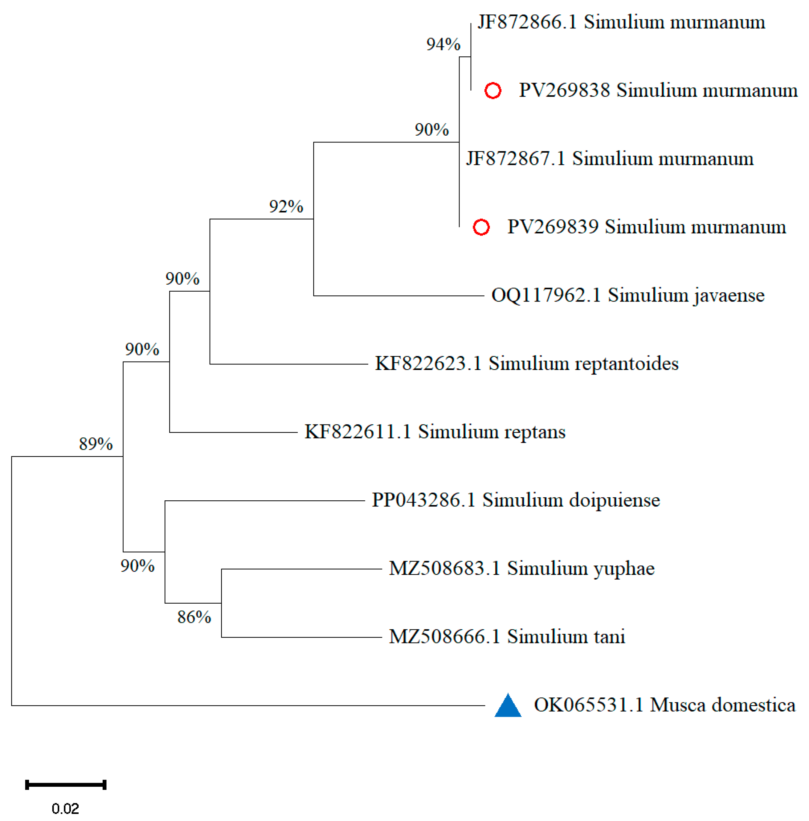 - Vaulin, O.V.; Petrozhitskaya, L.V.; Novgorodova, T.A. Genetic diversity of populations of Simulium reptans s.l. in Russia and Northern Kazakhstan. Zootaxa 2024, 5543, 329–342. [Google Scholar] [CrossRef] [PubMed]