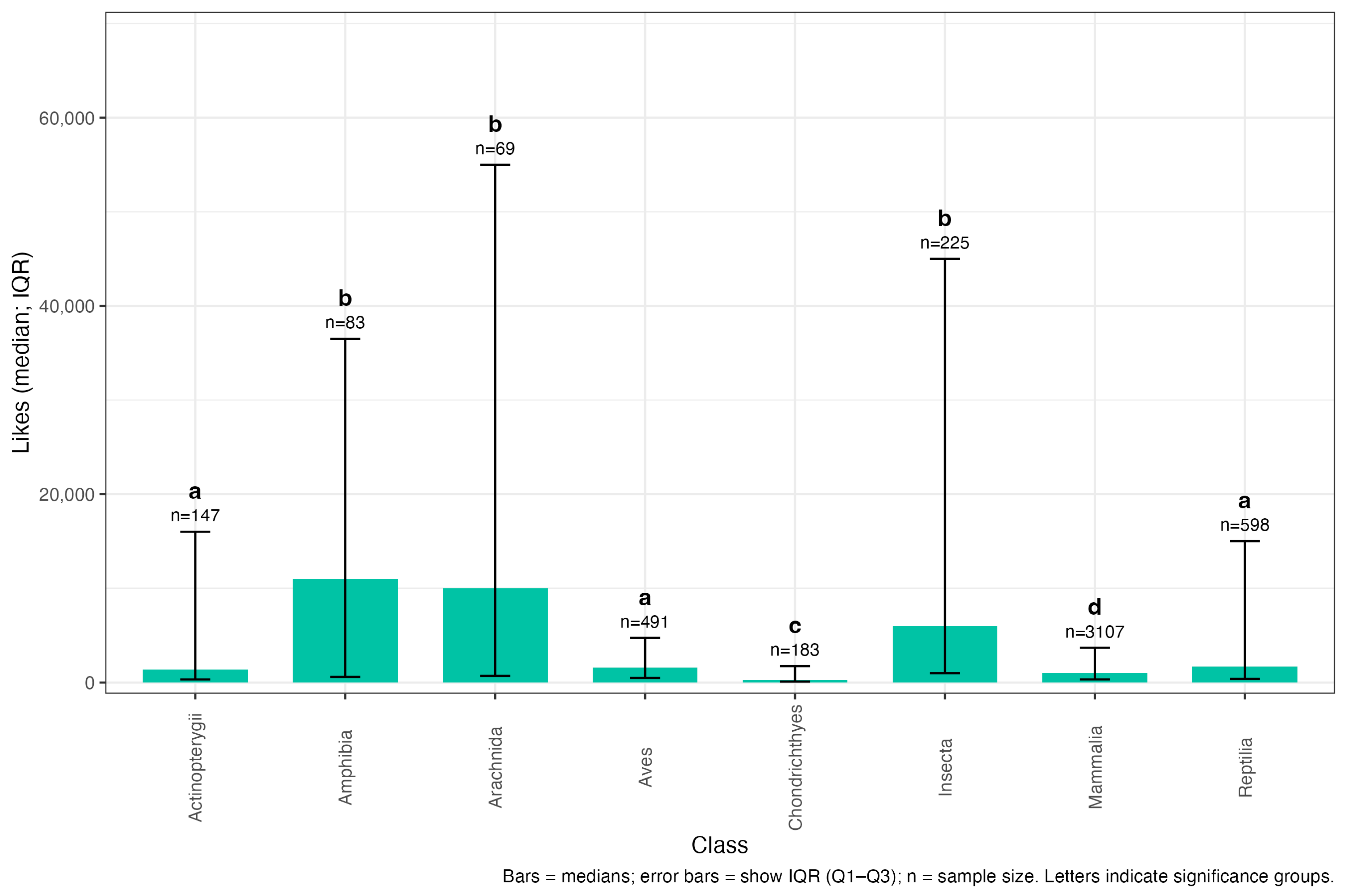 Figure 1) identified the following grouping from the highest to lowest number of likes: Amphibia, Arachnida, Insecta > Actinopterygii, Aves, Reptilia > Mammalia > Chondrichthyes.