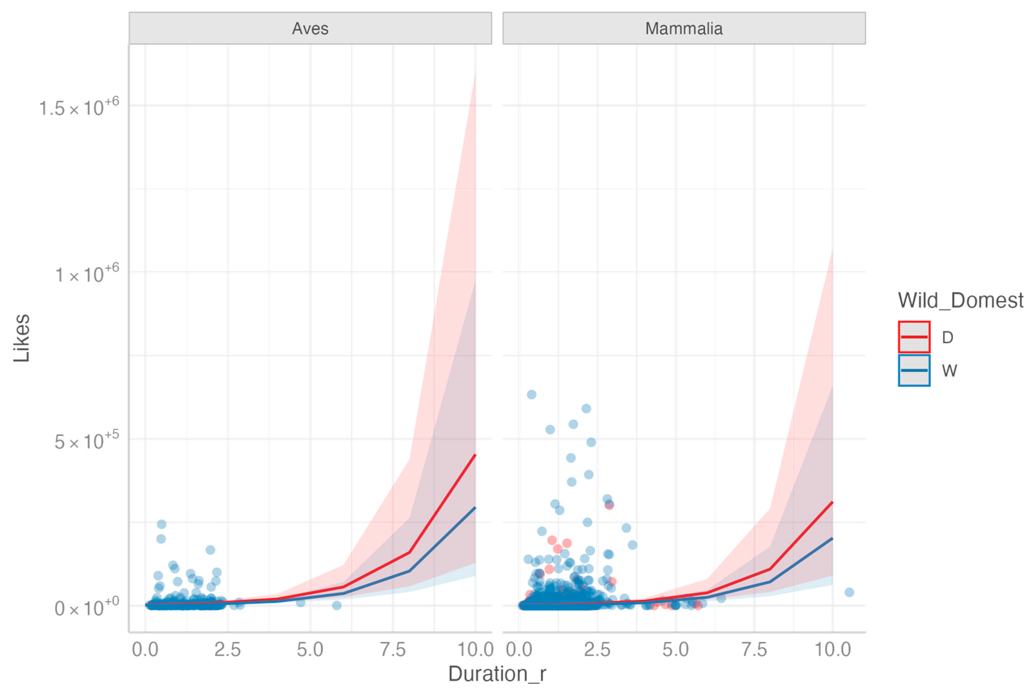 Table 4) receiving significantly fewer likes (EMM = 3752 95%, CI: 3231–4357) than domesticated taxa (EMM = 5768, 95% CI: 3928–8471). This means that wild animals received approximately 35% fewer likes than domesticated taxa, corresponding to a rate ratio of 0.65. Furthermore, a strong positive relationship was observed between video duration and the number of likes: longer videos received significantly more likes (β = 0.523 ± 0.069 SE, z = 7.56,