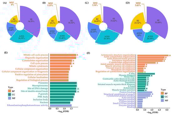 Statistics of AS events and GO functional enrichment of DASs. AS events of genes from WPDZ19_F (A), WPDZ19_M (B), WPHS_F (C), and WPHS_M (D) were calculated. SE represents skipped exons; A5SS represents alternative 5′ splice sites; A3SS represents alternative 3′ splice sites; MXE represents mutually exclusive exons; and RI represents retained introns. (E) GO enrichment analysis of DASs from the female group. (F) GO enrichment analysis of DASs from the male group. The top 10 most significant terms are presented. The stars in the figure indicate actin, cytoskeleton-related terms, the squares represent muscle-related terms, the circles indicate terms related to the cell cycle, and the triangles indicate terms related to DNA damage. BP represents biological process, CC represents cell component, and MF represents molecular function.