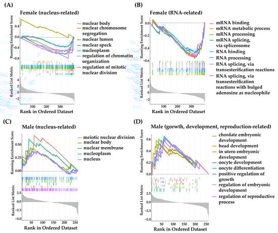 GSEA of DASs. (A) Nucleus-related GO terms enriched in female group. (B) RNA-related GO terms enriched in female group. (C) Nucleus-related GO terms enriched in male group. (D) Gorwth, development, reproduction-related GO terms enriched in male group.