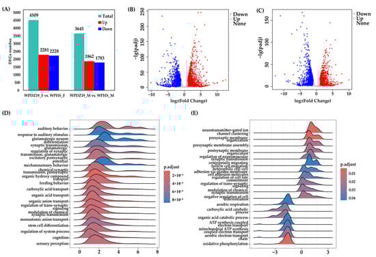 Supported by Illumina RNA-seq data, genes exhibiting |log2FC| ≥ 1 and q-value < 0.05 were identified as significant DEGs. In the female group, 4509 genes showed significantly differential expression, including 2281 up-regulated and 2228 down-regulated (Figure 3A,B). On the other hand, the comparison of male group revealed 3645 DEGs, including 1862 up-regulated and 1783 down-regulated (Figure 3A,C).