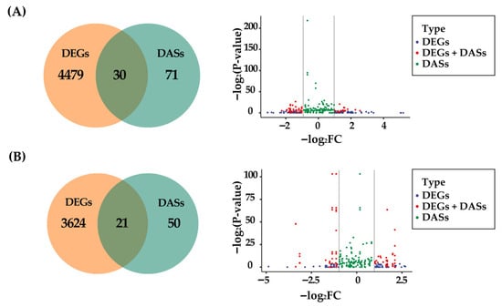 Overlapping analysis of DASs and DEGs. (A) Venn diagram and scatter plot of DASs and DEGs in the female group. (B) Venn diagram and scatter plot of DASs and DEGs in the male group. In the scatter plot, the horizontal axes represent the value of −log2FC, and the vertical axes represent the value of −log2(p-value).