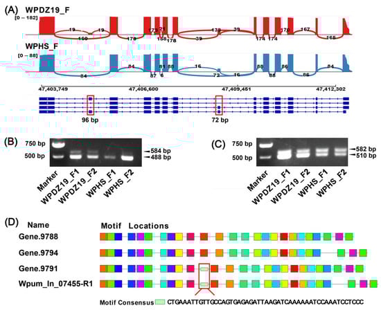 Alternative splicing events analysis and RT-PCR gene verification. (A) The different alternative splicing types of Wpum_In_07455 gene in female group. Blocks represent exons and lines represent introns. The thickness of the curves in red and blue crossing two splicing junction sites represents the coverage degree of PacBio full-length sequencing reads, and the number of junction reads is marked in the middle of the splicing site. The RNA coverage is marked on the left by the number of reads. (B,C) Two exon-skipping events with 96 bp and 72 bp, respectively, in Wpum_In_07455 were verified by RT-PCR. (D) Motif prediction among the four transcripts of the Wpum_In_07455 gene. Different colored boxes represent different motifs.