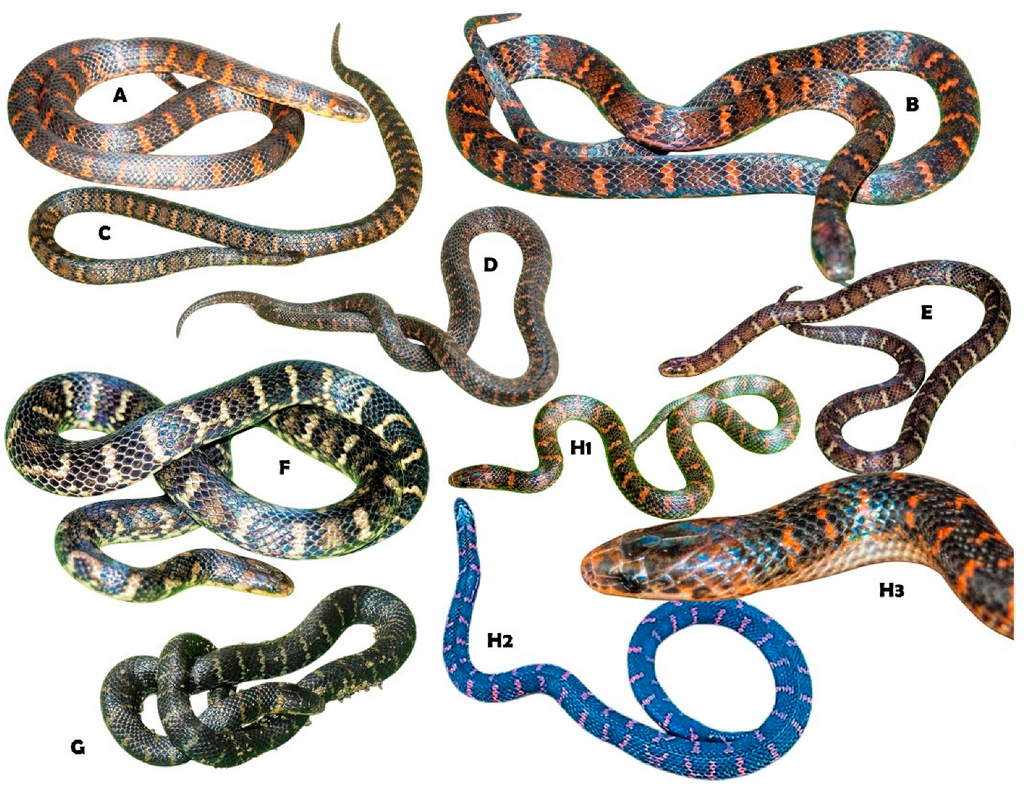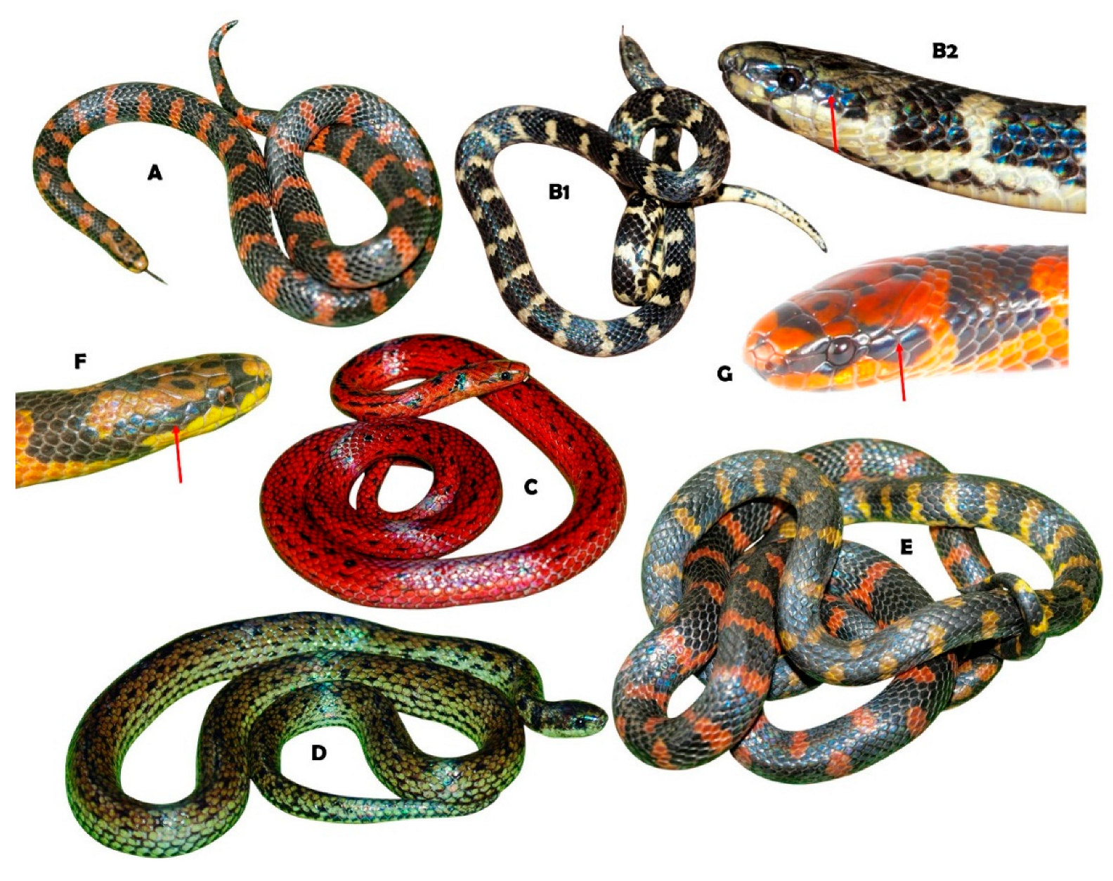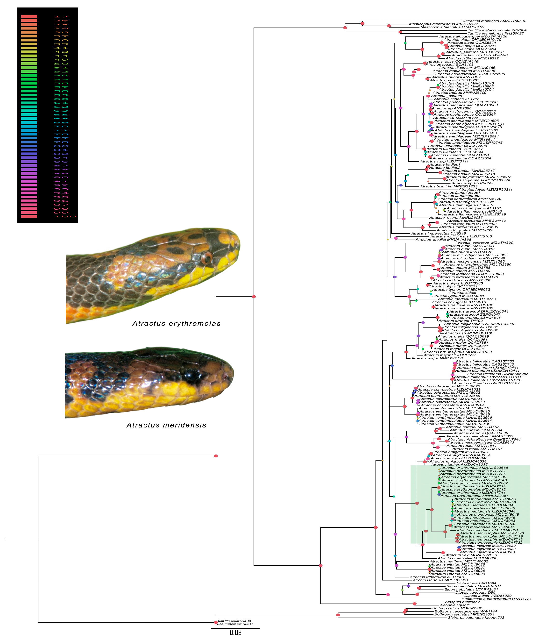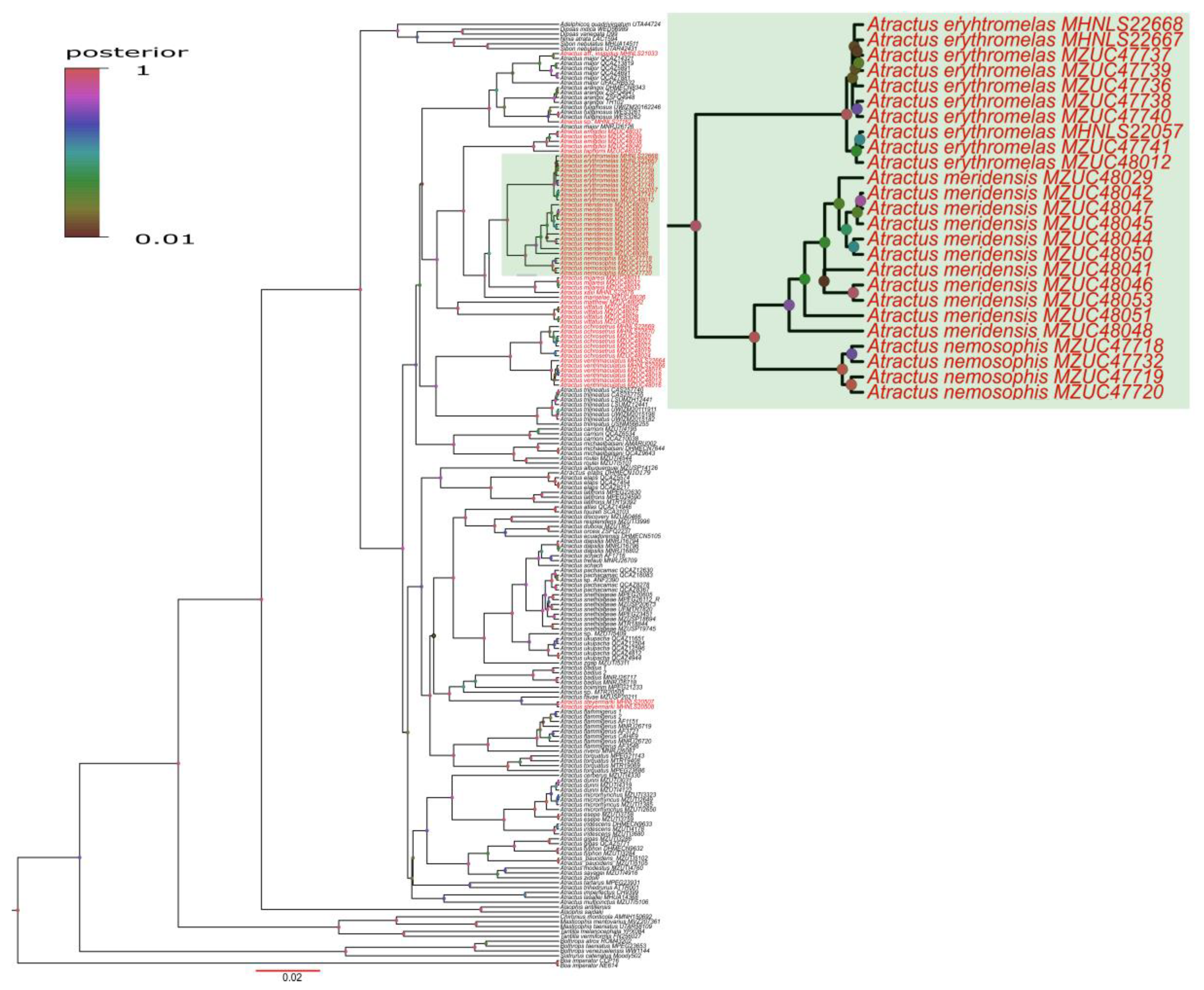 - Melo-Sampaio, P.R.; Passos, P.; Prudente, A.L.C.; Venegas, P.J.; Torres-Carvajal, O. Systematic review of the polychromatic ground snakes Atractus snethlageae complex reveals four new species from threatened environments. J. Zool. Syst. Evol. Res. 2021, 59, 718–747. [Google Scholar] [CrossRef]