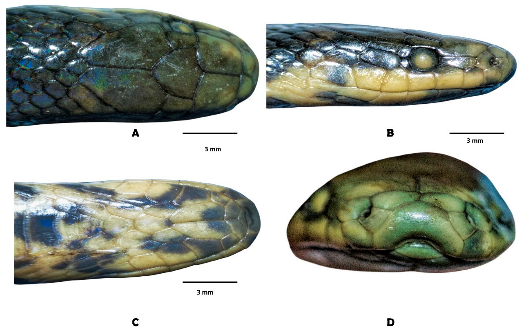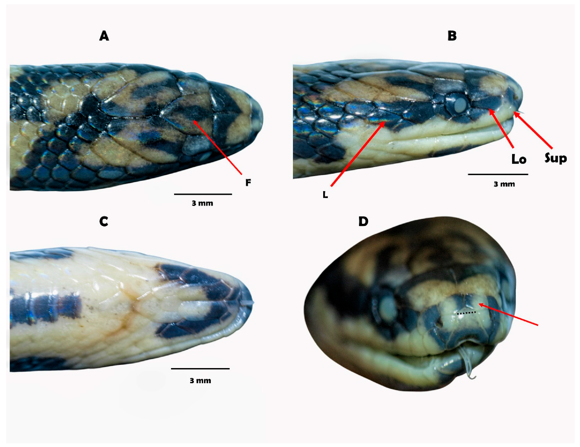 | Supralabial-rostral contact | Ample, supralabial scale pentagonal but does not form an angle, that is, protrusion between postnasal and prenasal. Enlarged supralabial | Short-moderate, usually the supralabial scale is pentagonal, taller than wide, forming an angle, that is, postnasal and prenasal project. Small or moderate supralabial | Ample, supralabial scale pentagonal but does not form an angle, protrusion between postnasal and prenasal. Enlarged supralabial | Short, supralabial scale pentagonal, taller than wide, protrusion between postnasal-prenasal. Small supralabial |
