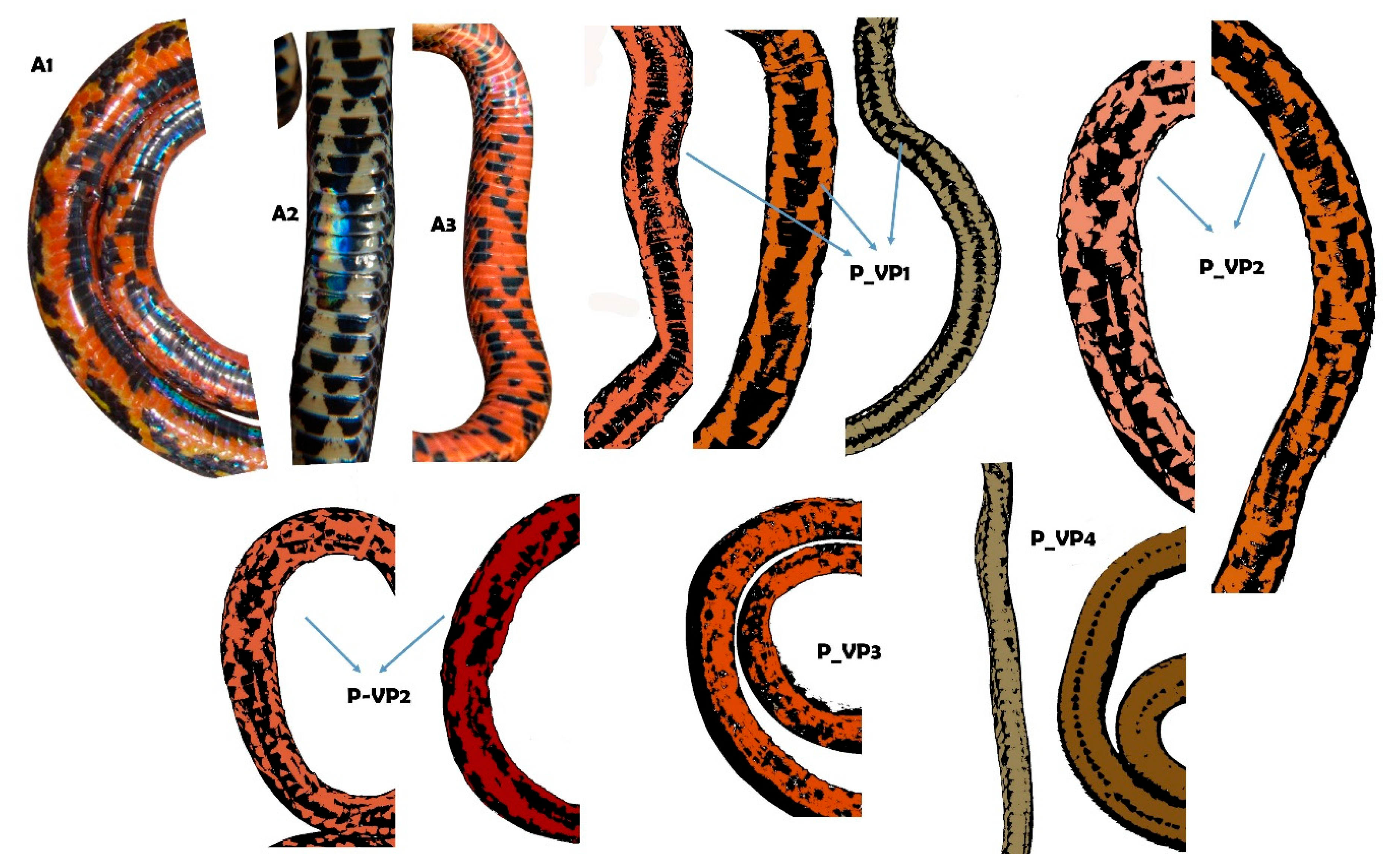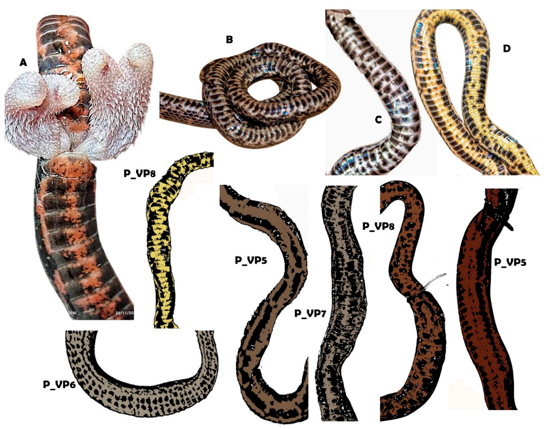 - Prudente, A.L.C.; Passos, P. Morphological variation, polymorphism, and Taxonomy of the Atractus torquatus complex Serpentes: Dipsadidae. Zootaxa 2012, 3407, 1–21. [Google Scholar] [CrossRef]