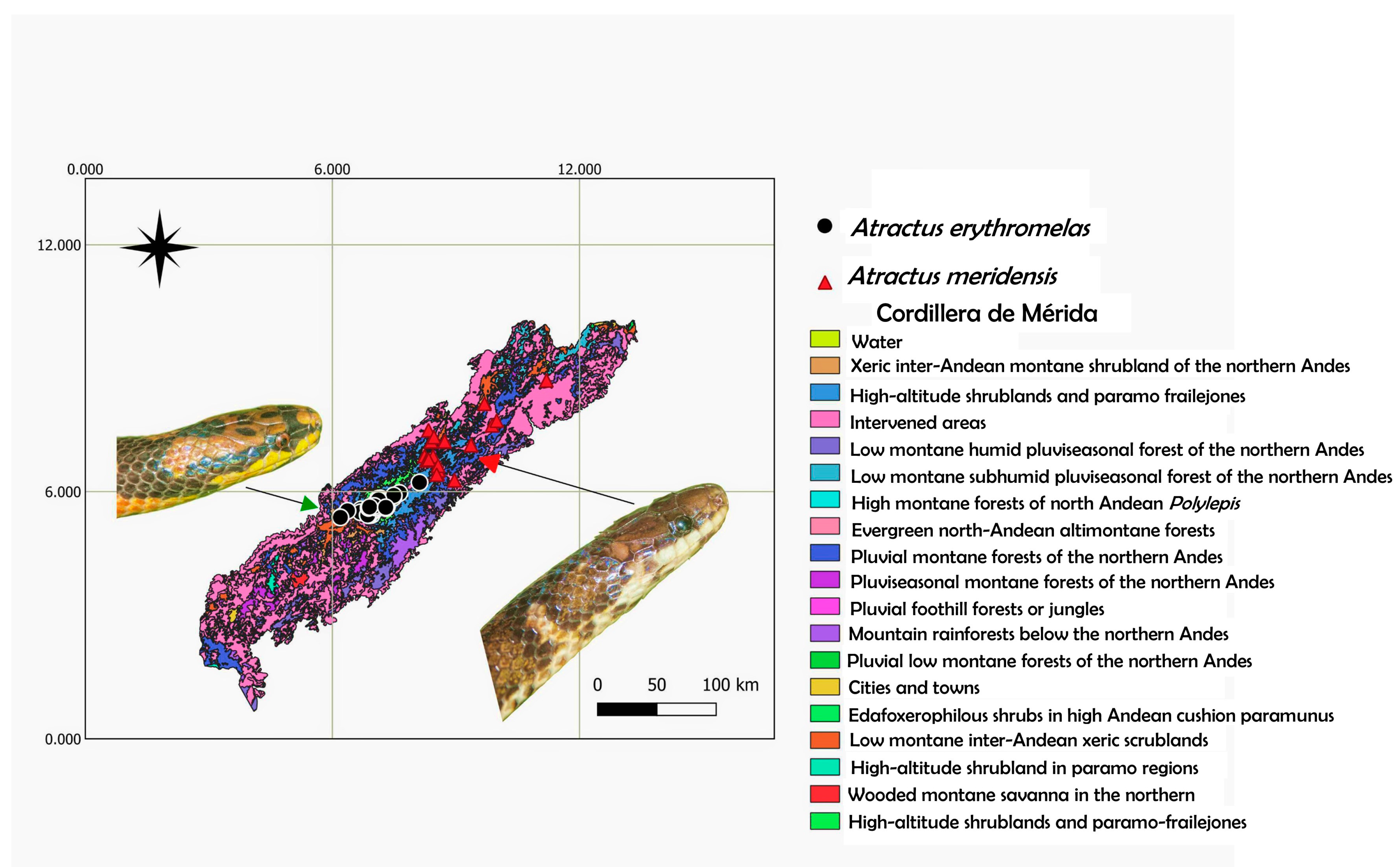 - Esqueda, L.F.; La Marca, E. Revisión taxonómica y biogeográfica (con descripción de cinco nuevas especies) del género Atractus (Colubridae: Dipsadinae) en los Andes de Venezuela. Herpetotropicos 2005, 2, 1–32. [Google Scholar]