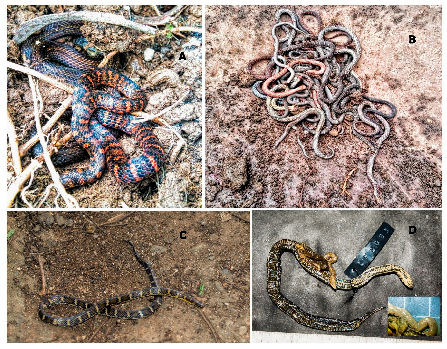 - Balestrin, R.L.; Di-Bernardo, M.; Moreno, A.G. Feeding ecology of the neotropical worm snakes Atractus reticulatus in southern Brazil. Herpetol. J. 2007, 17, 62–64. [Google Scholar]