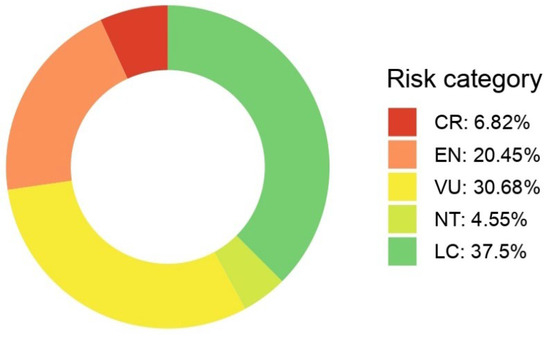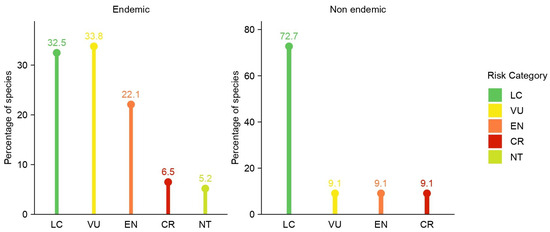 In contrast, among the 11 non-endemic species, 1 (9.1%) was classified as CR, 1 (9.1%) as EN, and 1 (9.1%) as VU, totaling 3 species (27.3%) categorized as threatened. None of the non-endemic species were assessed as NT, while the remaining 8 (72.7%) were classified as LC.
