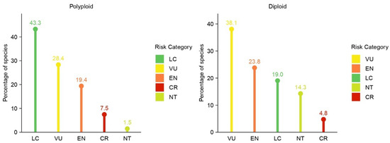 Ploidy level was also considered in the assessment of the Limonium species, revealing notable differences in conservation status between polyploid and diploid taxa (Figure 3). Among the 67 polyploid species, 5 (7.5%) were classified as CR, 13 (19.4%) as EN, and 19 (28.3%) as VU. In total, 37 polyploid species (55.2%) were categorized as threatened. One additional polyploid species (1.5%) was assessed as NT, while 29 species (43.3%) were categorized as LC.
