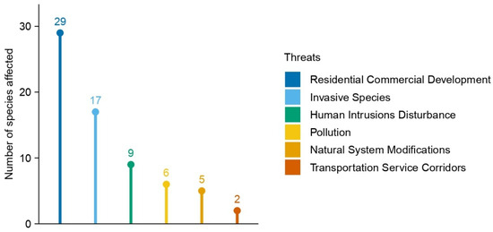 Our threat analysis for the 51 threatened Limonium species highlights direct anthropogenic pressures as principal drivers of decline. Residential and Commercial Development emerged as the most pervasive threat, impacting over half (56.9%) of these species. This is consistent with the coastal habitat preference of many Limonium taxa, where urbanization and expansion of tourist infrastructure cause habitat loss and fragmentation [6,7]. The significant impact of Invasive Species (33.3%) and Human Intrusions and Disturbance (17.6%) also contribute substantially to habitat degradation [6,41].
