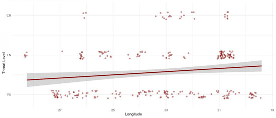 The ordinal regression analysis confirmed that longitude was the only statistically significant predictor of threat category (Estimate: −0.136, p = 0.0238). Latitude, with a p-value of 0.6389, was not found to be a significant predictor of extinction risk in this model. The negative estimate for longitude indicates that an increase in longitude (moving eastward) is associated with a lower probability of a species being in a higher threat category, a trend visually supported by the model plot (Figure 6).