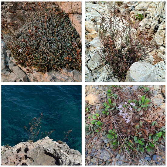 - Limonium albomarginatum. This Greek narrow-endemic species is restricted to a single location on the Mani Peninsula in the southern Peloponnese, with a small population of approximately 500 mature individuals [47]. The primary threat it faces is the expansion of invasive species, Carpobrotus edulis and Opuntia ficus-indica. As no conservation measures are currently in place, a dual strategy is recommended: controlling invasives in the habitat and implementing ex situ measures such as seed banking and living collections. Further research is needed to better understand its ecology and population dynamics, as it is considered a high-conservation-priority taxon [13].