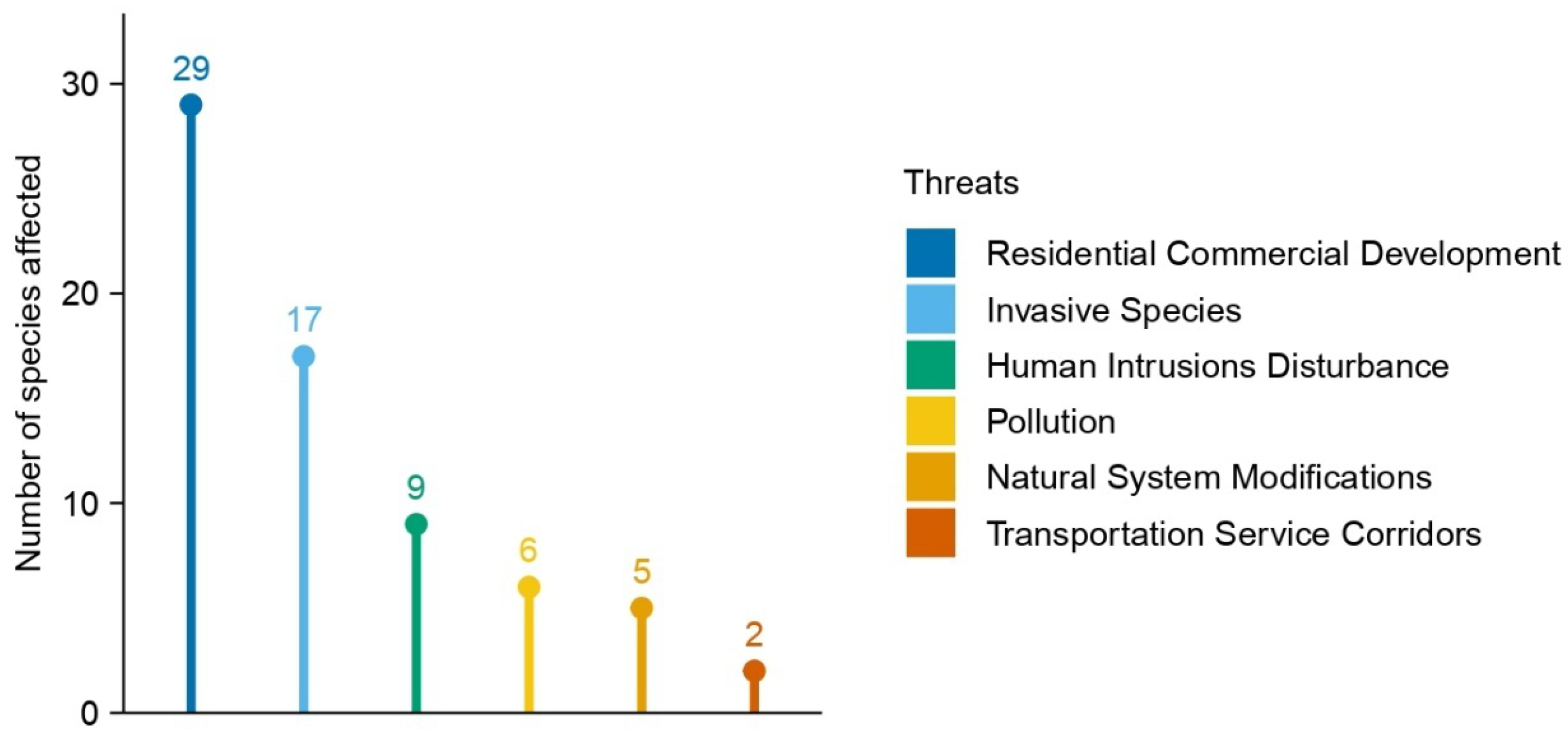 The distribution of the main threats impacting Limonium species in Greece. The numbers reflect the total count of threatened species affected by each threat category.