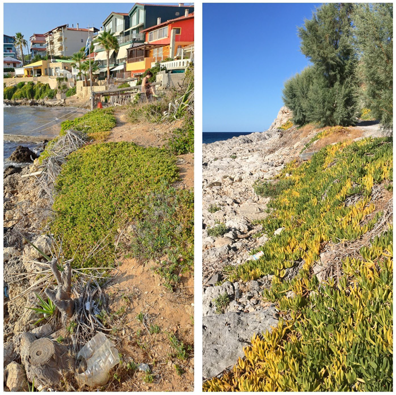 The analysis of threats affecting the 51 Greek Limonium species categorized as threatened showed distinct and consistent patterns (Figure 4). The most prevalent threat was Residential and Commercial Development, impacting 29 species (56.9%), often observed directly along the coastal Limonium habitats (Figure 5). Invasive Species represented the second most common threat, affecting 17 species (33.3%), with mat-forming species of the Aizoaceae family contributing to habitat degradation and competition (Figure 5). Human Intrusions and Disturbance impacted 9 species (17.6%). Additional threats included Pollution (6 species; 11.8%) and Natural System Modifications (5 species; 9.8%). The least frequent threat was Transportation and Service Corridors, recorded for only 2 species (3.9%).
