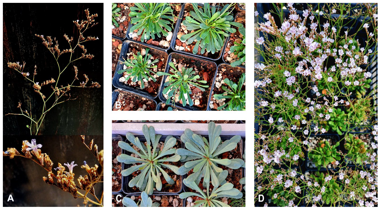 Living collections of four Critically Endangered Greek endemic Limonium species. (A) Inflorescence of ex situ grown Limonium albomarginatum, (B) Cultivated individuals of Limonium nichoriense, (C) Cultivated individuals of Limonium korakonisicum, (D) Flowering individuals of Limonium aphroditae in cultivation.
