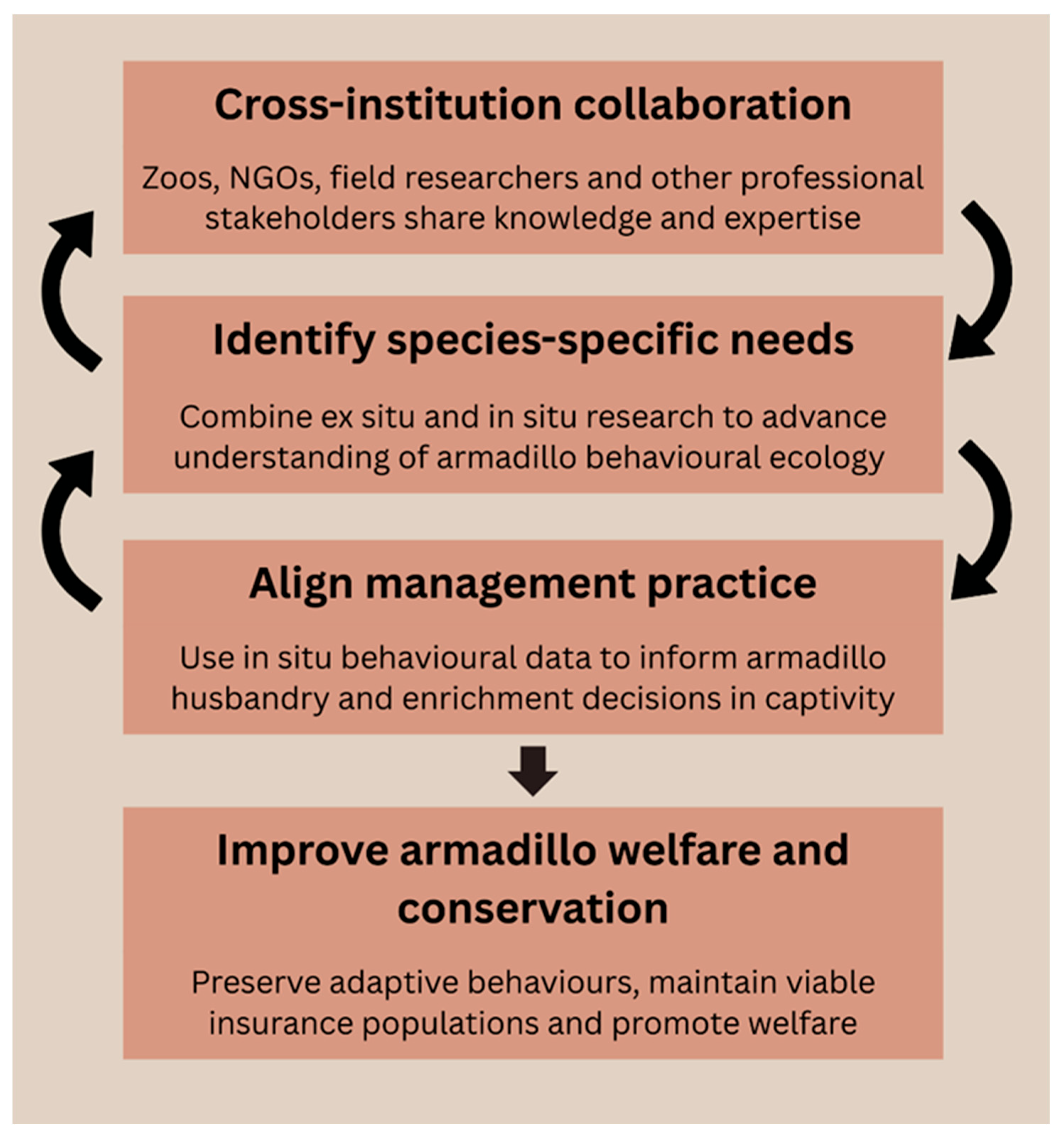 What is the wild ecology of armadillos? | Conduct longitudinal field studies to investigate seasonal variation in behaviour across armadillo species. | Inform husbandry, management, and enclosure design aligned with species-specific needs | Superina [55] Rodrigues et al. [64] Desbiez and Atiias [74] Maccarini et al. [130] |