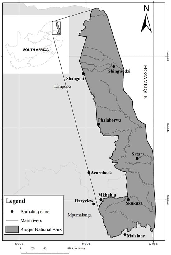 Geographical map of the study sites, both inside and outside the Kruger National Park [].