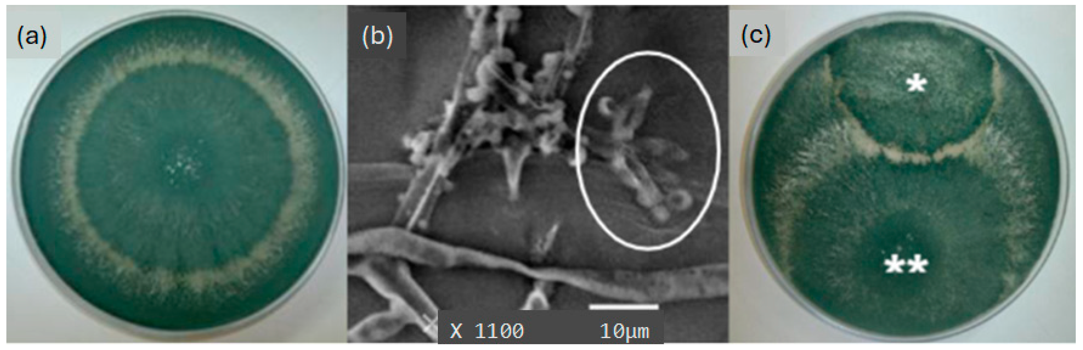 - Moreno-Ruiz, D.; Lichius, A.; Turrà, D.; Di Pietro, A.; Zeilinger, S. Chemotropism Assays for Plant Symbiosis and Mycoparasitism Related Compound Screening in Trichoderma atroviride. Front. Microbiol. 2020, 11, 601251. [Google Scholar] [CrossRef] [PubMed]