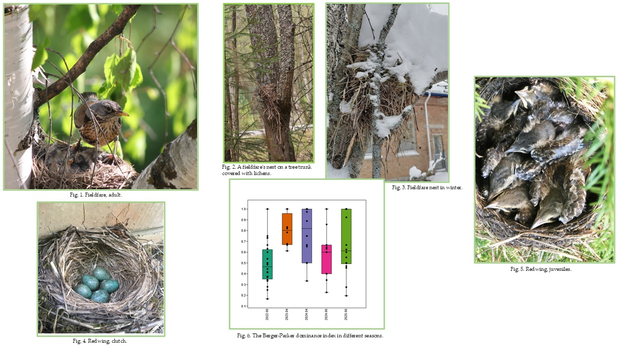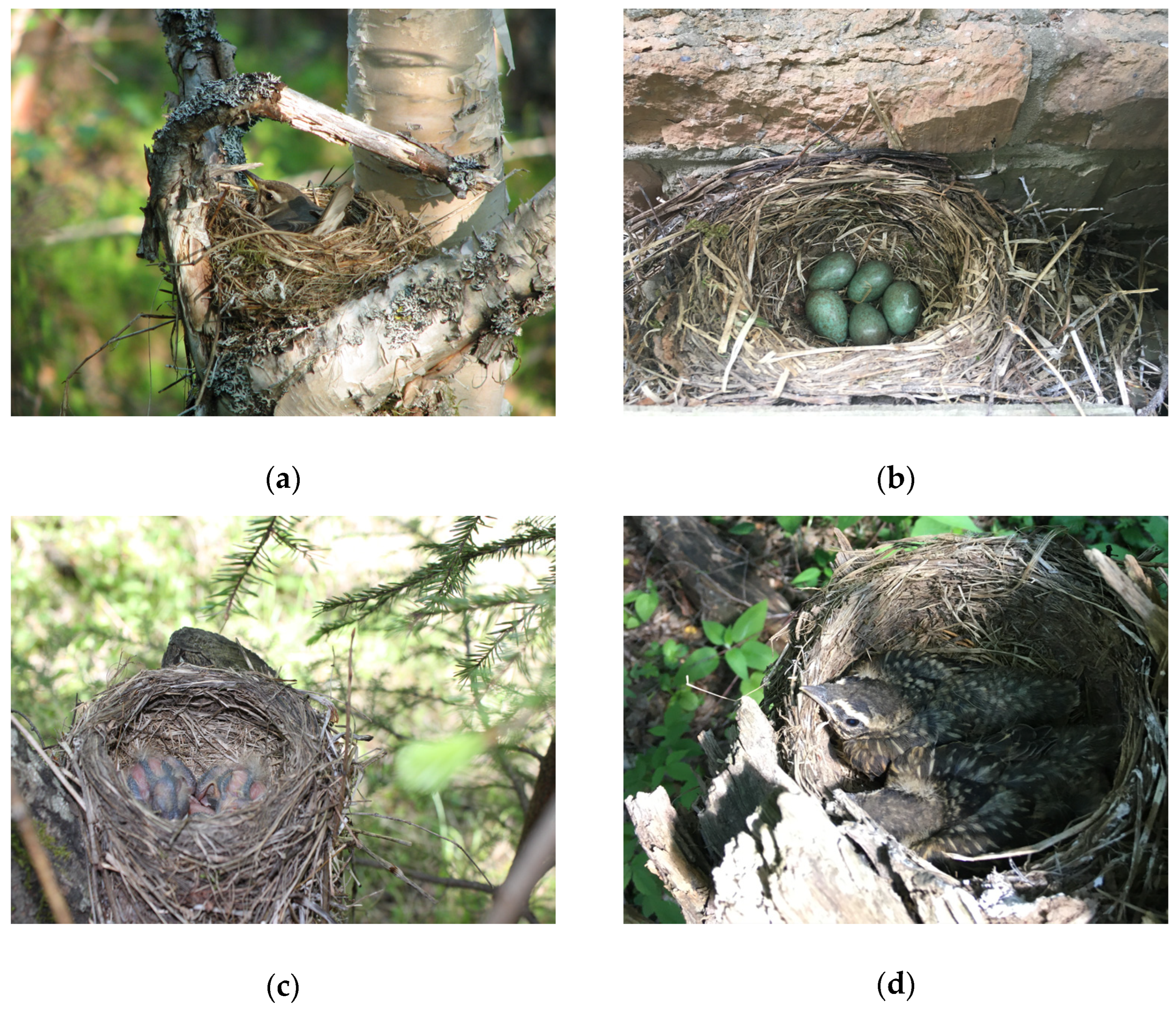 About 35 nests have been monitored annually within an area of 20 hectares in the territory of the Radiobiological Complex (2021—30, 2022—44, 2023—38, 2024—33, 2025—29). The nests were inspected once a week or even more frequently. We recorded the beginning and the end of nesting, the size of the clutch, the number of hatched chicks, and the number of flown-out juveniles. We fixed the height of the nest and the lining substrate. At the end of the nesting period, the nests were collected. Some nests remained empty for a longer period after chicks had left them (the period of empty nest was 300 days or more—‘overwintered nests’). The duration of the nesting cycle (nest habitation time) was calculated as the difference between the flying-out date and the first egg laying date. The analysis included data on 168 collected thrush nests over a five-year period (138 fieldfare (