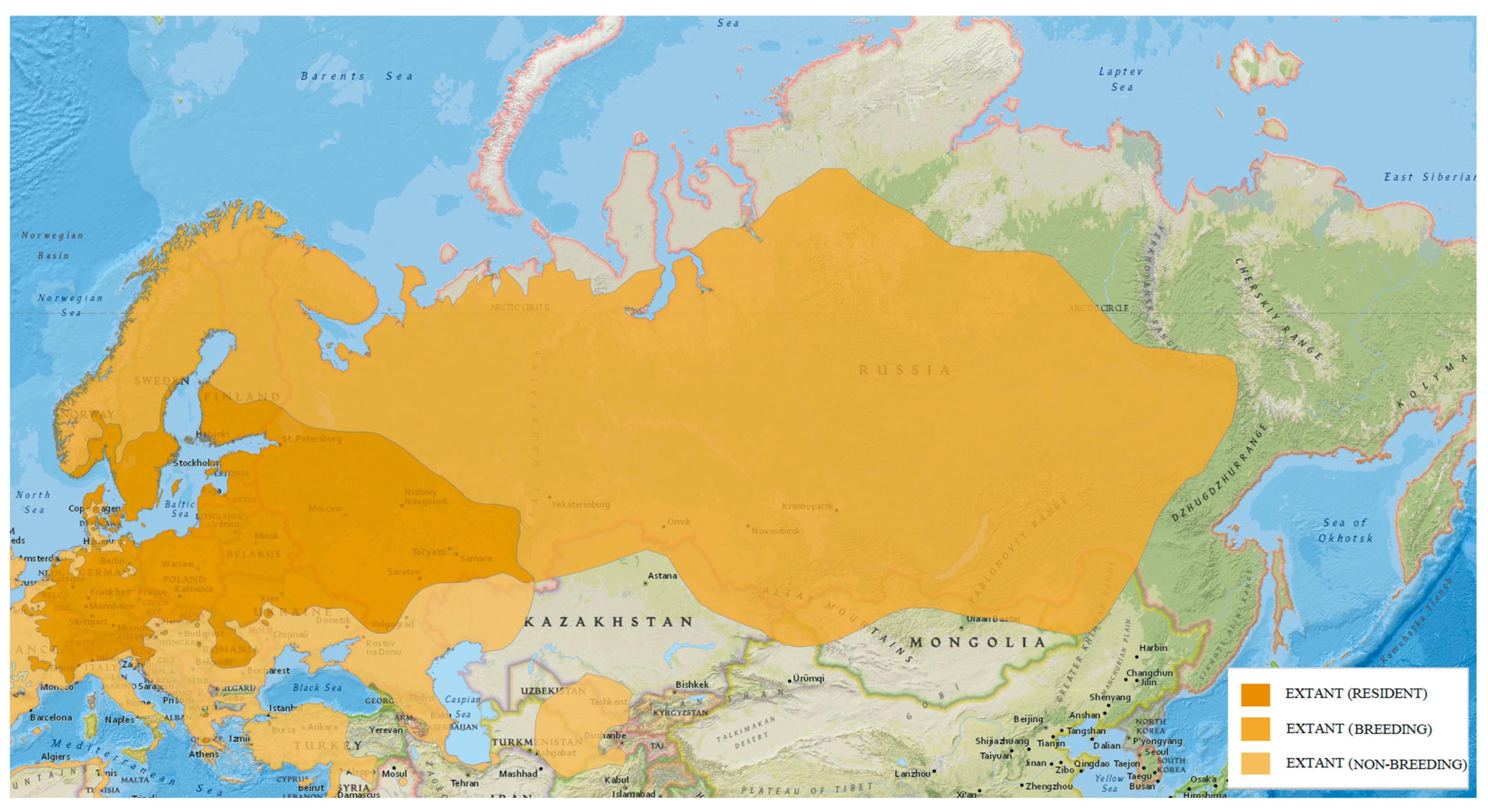 28]. It winters in the south of its range. Wintering grounds are located in the Mediterranean, Central Asia, and North Africa [