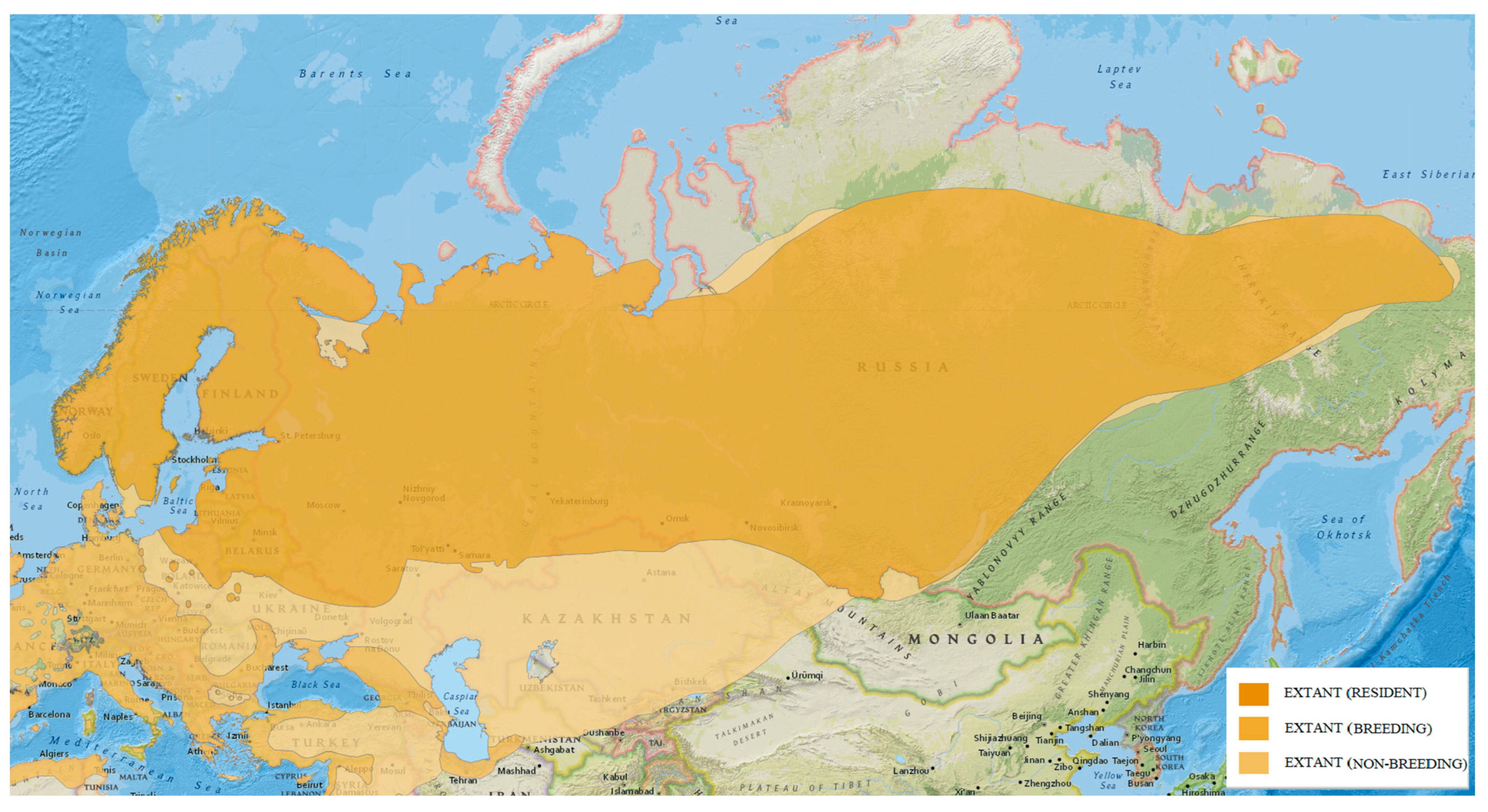 33]. In the territory of the European north-east of Russia, redwing is a breeding migratory species, which is common in the southern and middle taiga, few in the northern taiga, and rare in the extreme northern taiga [