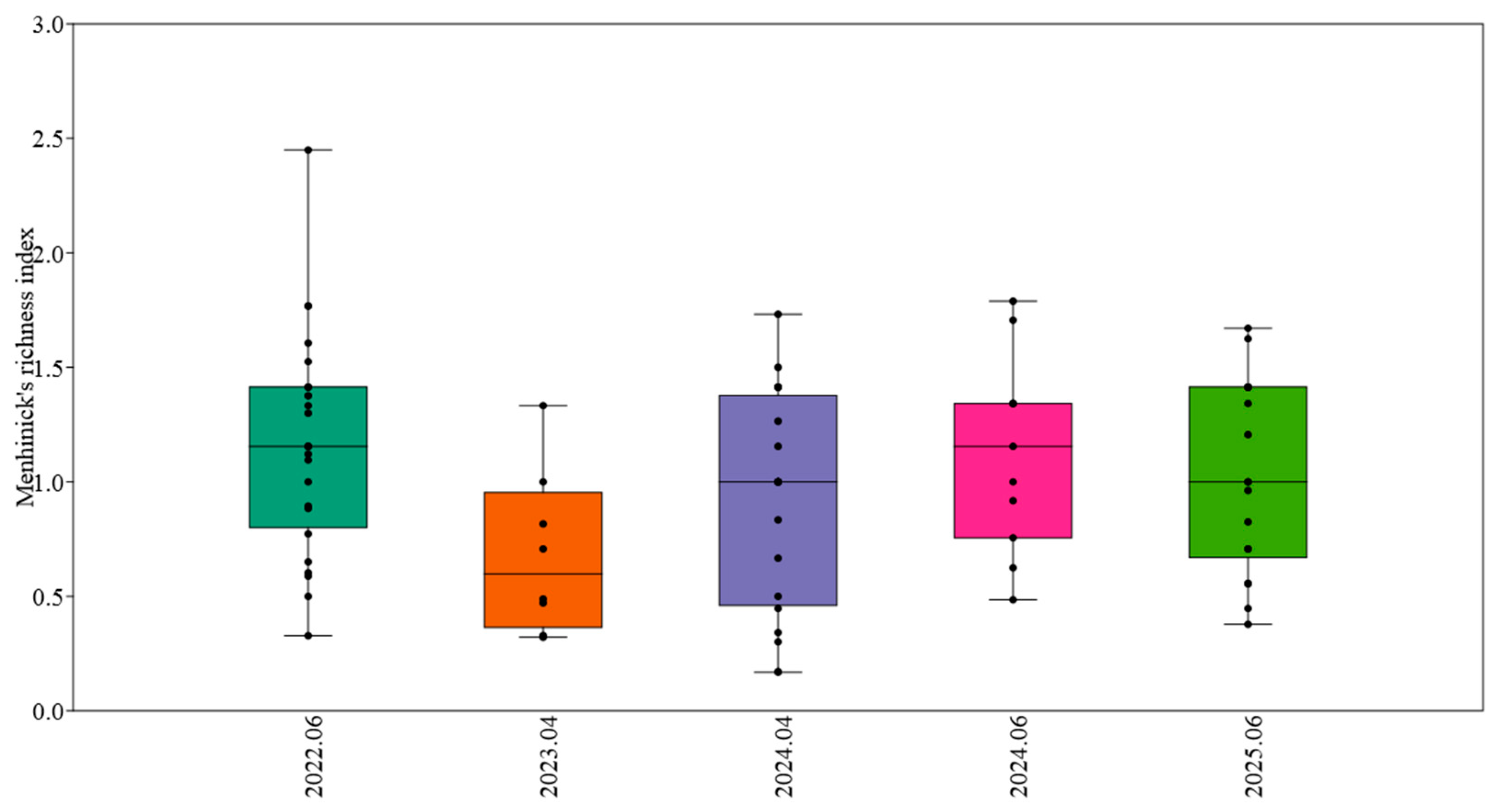 Figure 8) calculated for each nest, taking into account the period of its collection, showed the presence of certain differences in species diversity between samples collected in spring and summer. In the case of the Menhinick index (