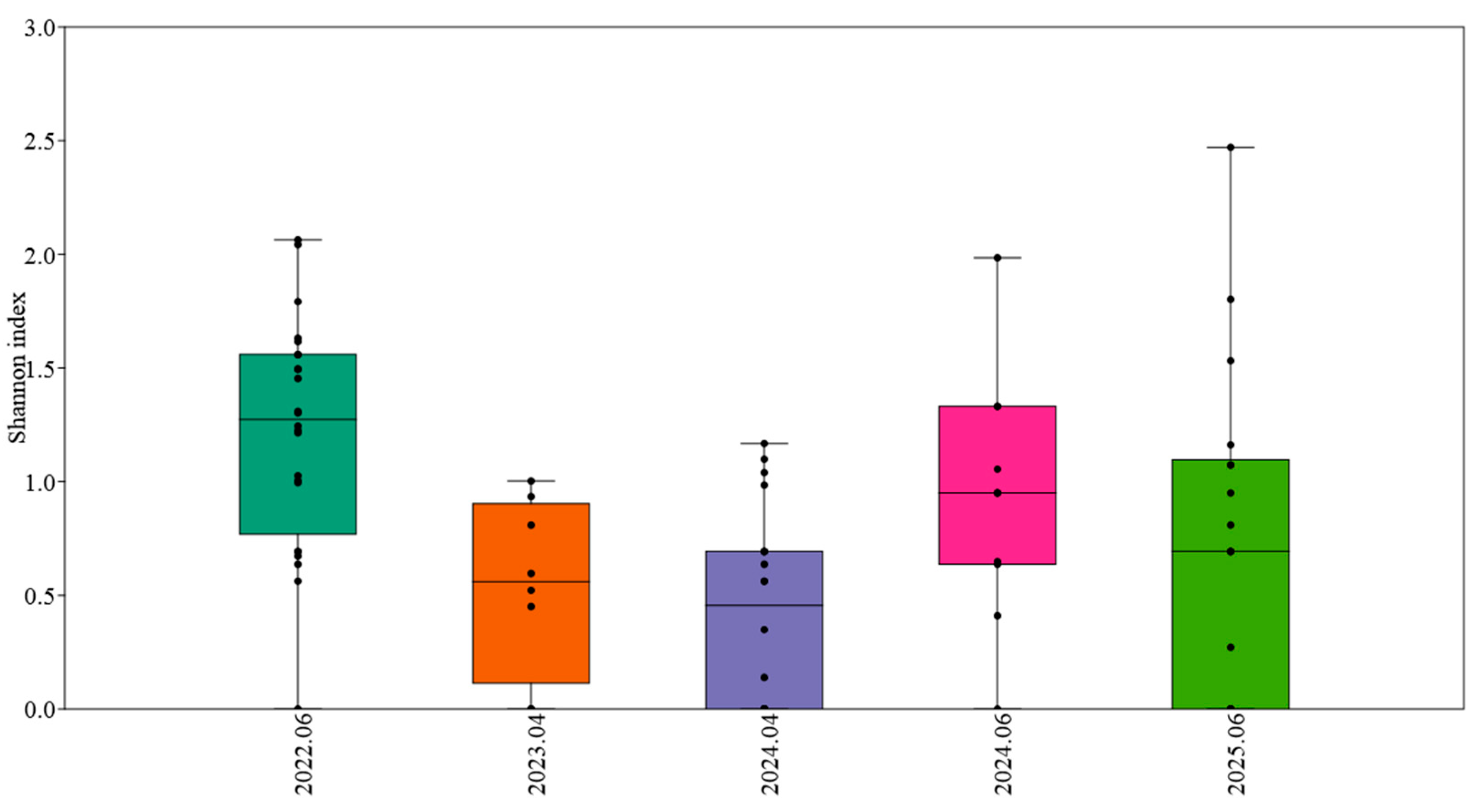 Pairwise comparison of samples by the Menhinick index (U-test) showed no statistically significant differences between the samples. A similar comparison by the Shannon index showed a statistically significant decrease in the index in April 2023 (Z = 3.11, p = 0.019) and 2024 (Z = 4.25, p < 0.001) compared to June 2022.