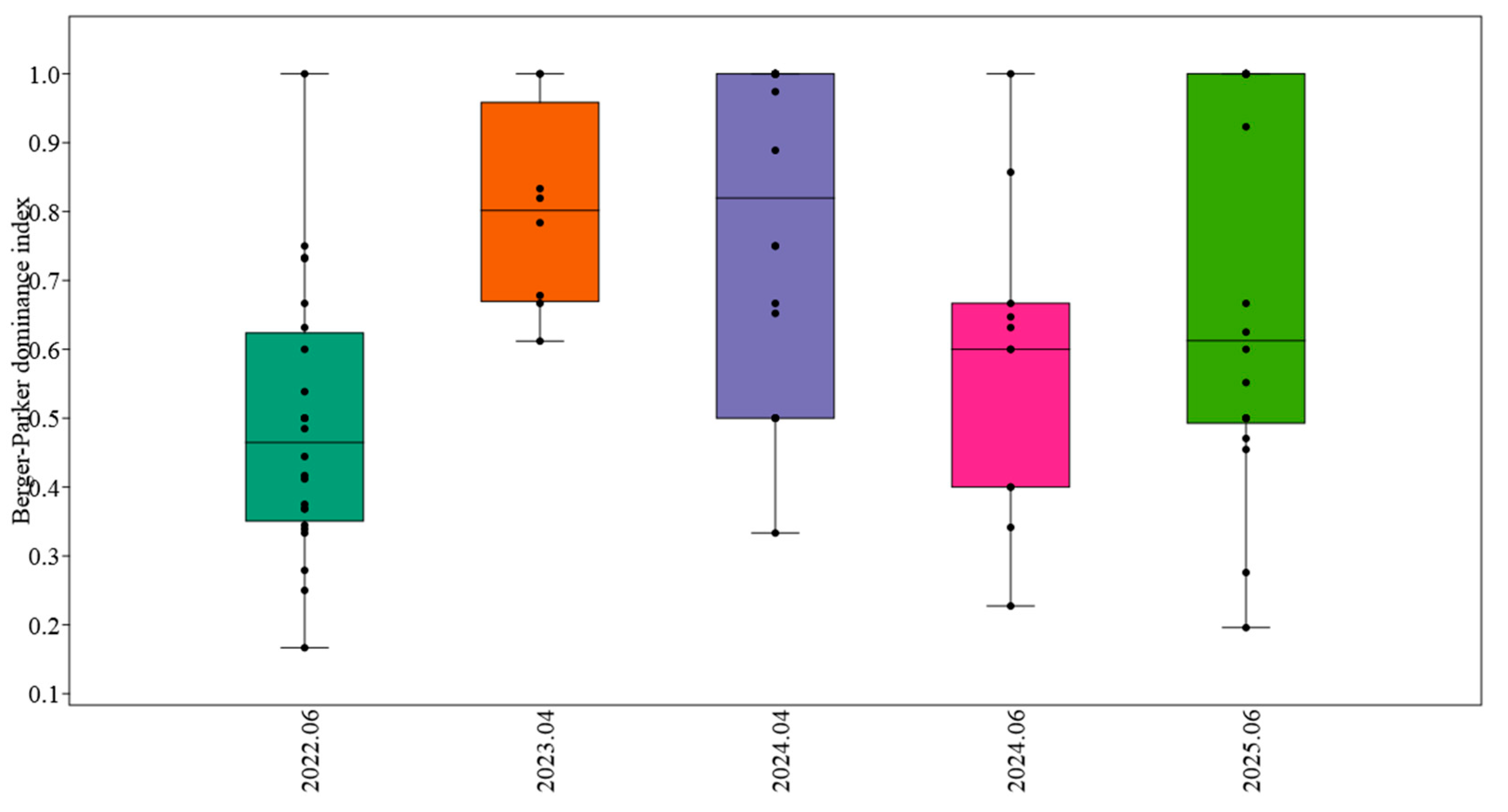 Significant differences were also observed for the Berger–Parker index (Kruskal-Wallis test,