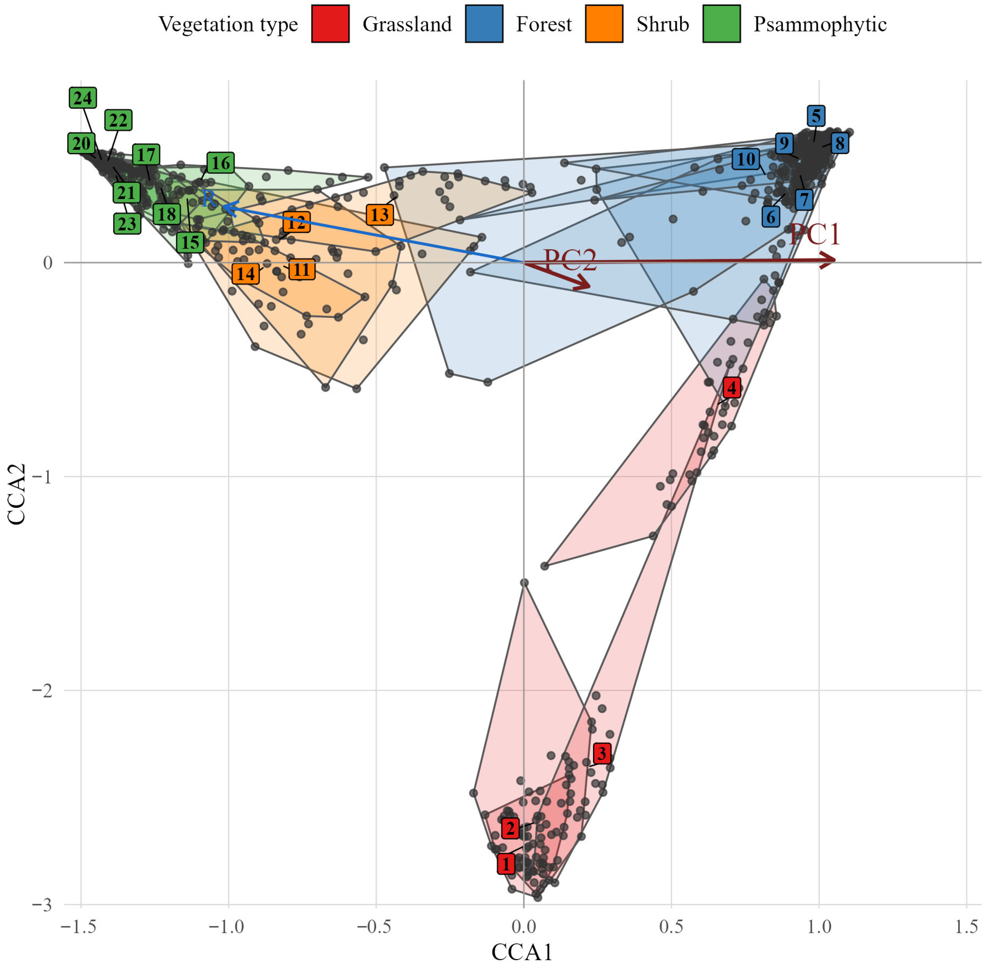 CCA1 was positively correlated with soil moisture and nutrient availability, and negatively correlated with light availability, temperature, soil pH, and continentality, thereby reflecting a transition from dry, nutrient-poor sandy habitats to moist, fertile sites with denser vegetation. The principal component analysis (PCA) of the environmental factors extracted two principal components with eigenvalues greater than one (